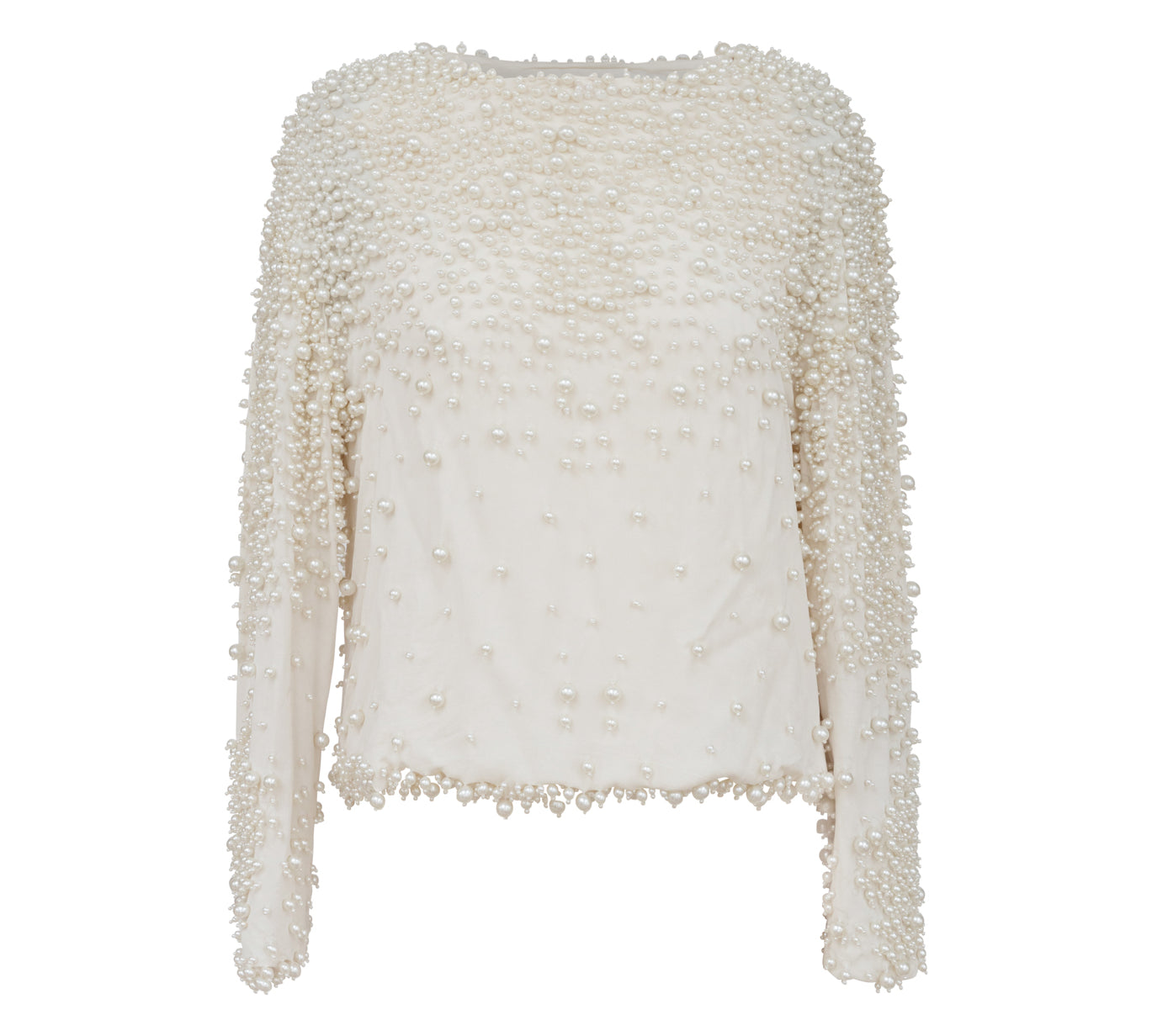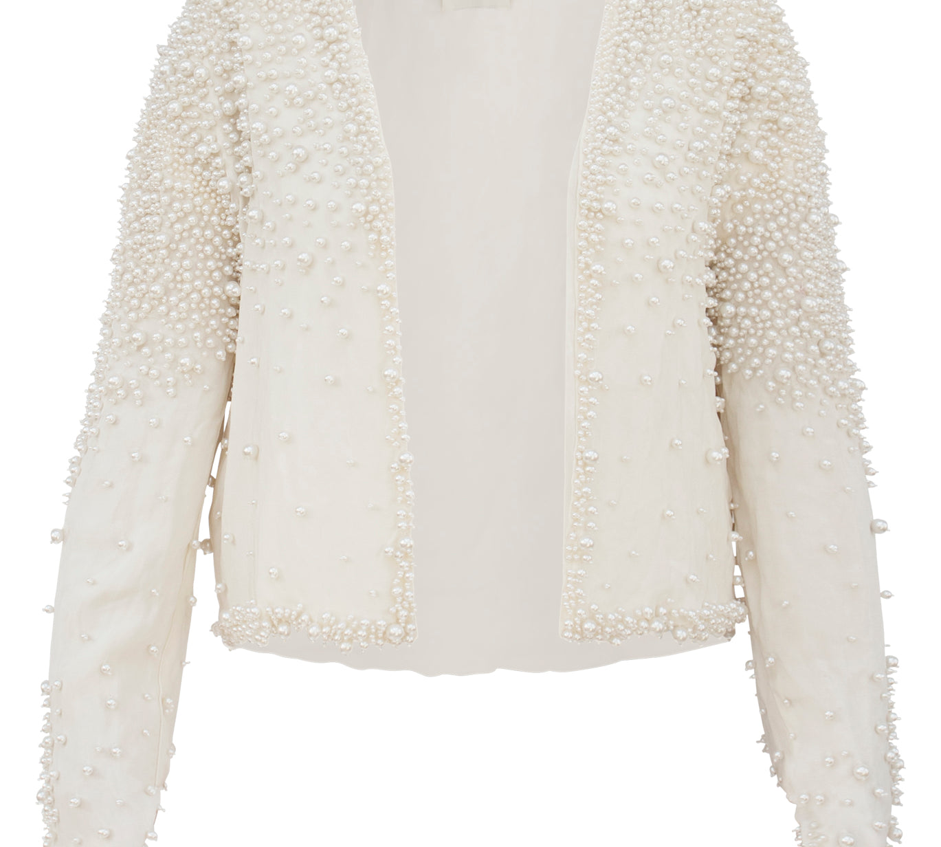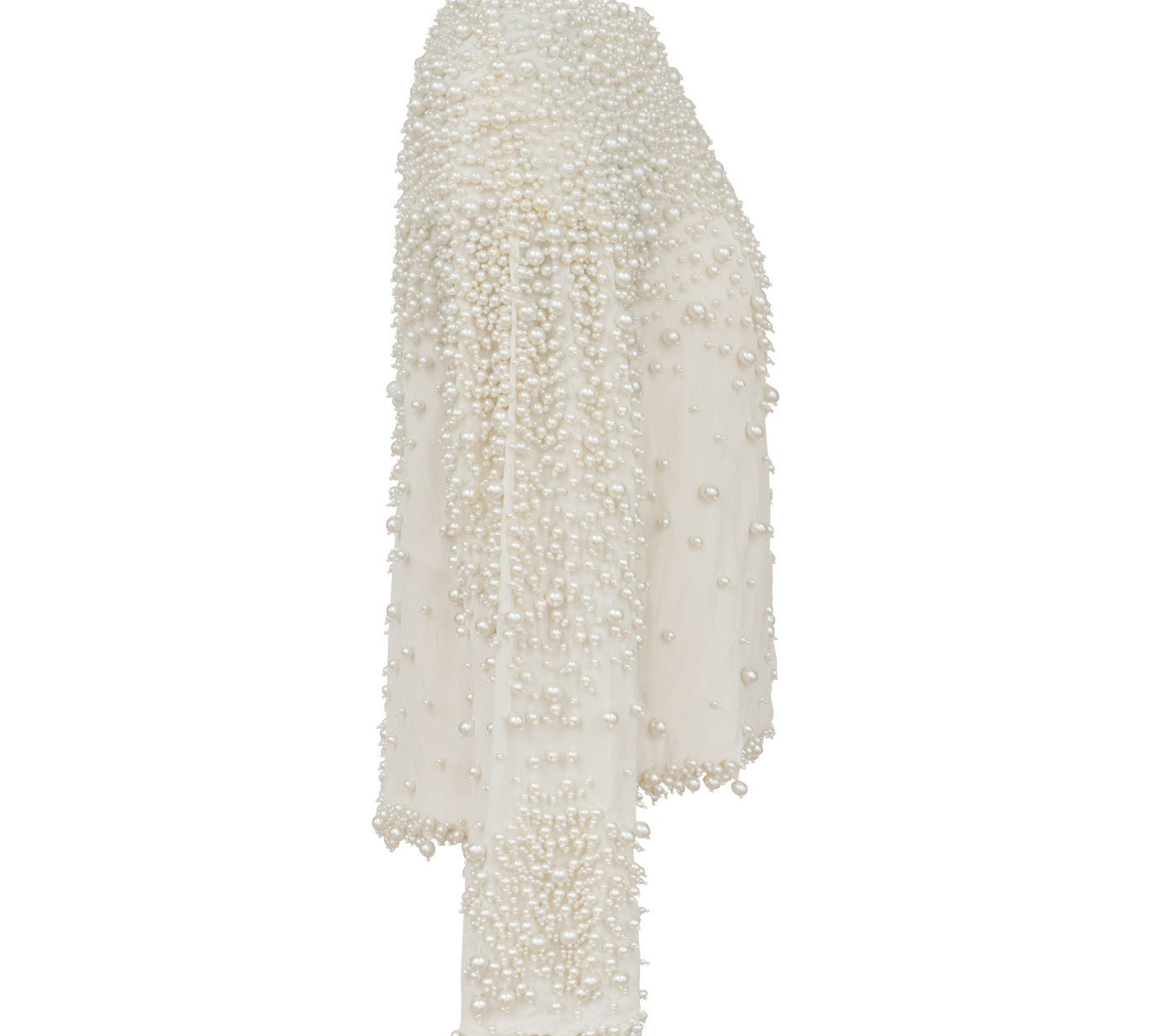 This capsule collection’s trophy piece is designed to be styled with jeans and a tee, dressed-up in the evening or as a bridal accessory. It is made from the highest quality viscose to ensure durability to hold the heavy beading with each high-quality pearl beaded by hand onto the fabric taking fives days to make. The Duster and Blouse can be styled together.