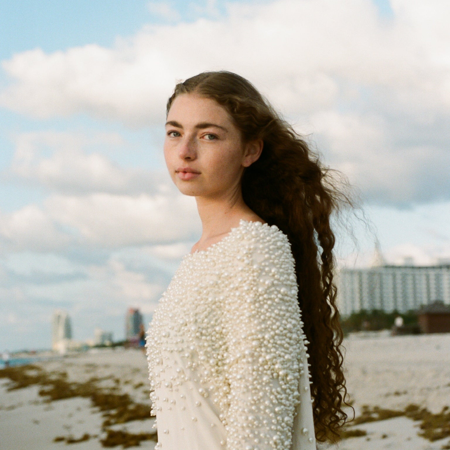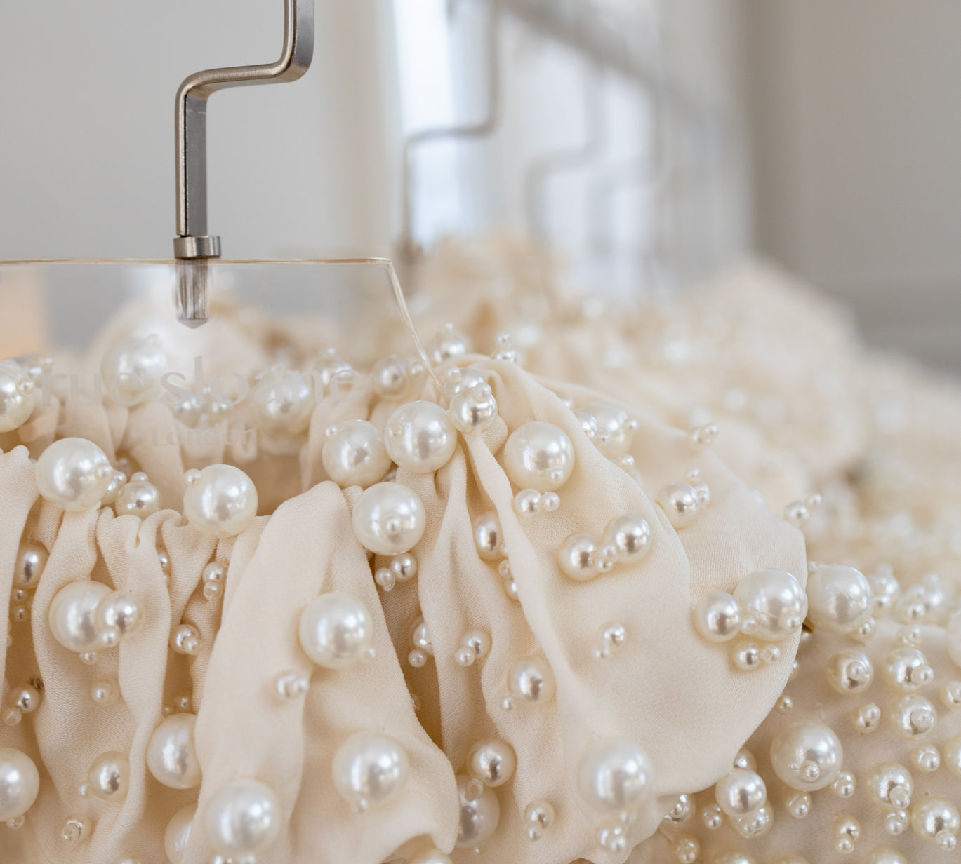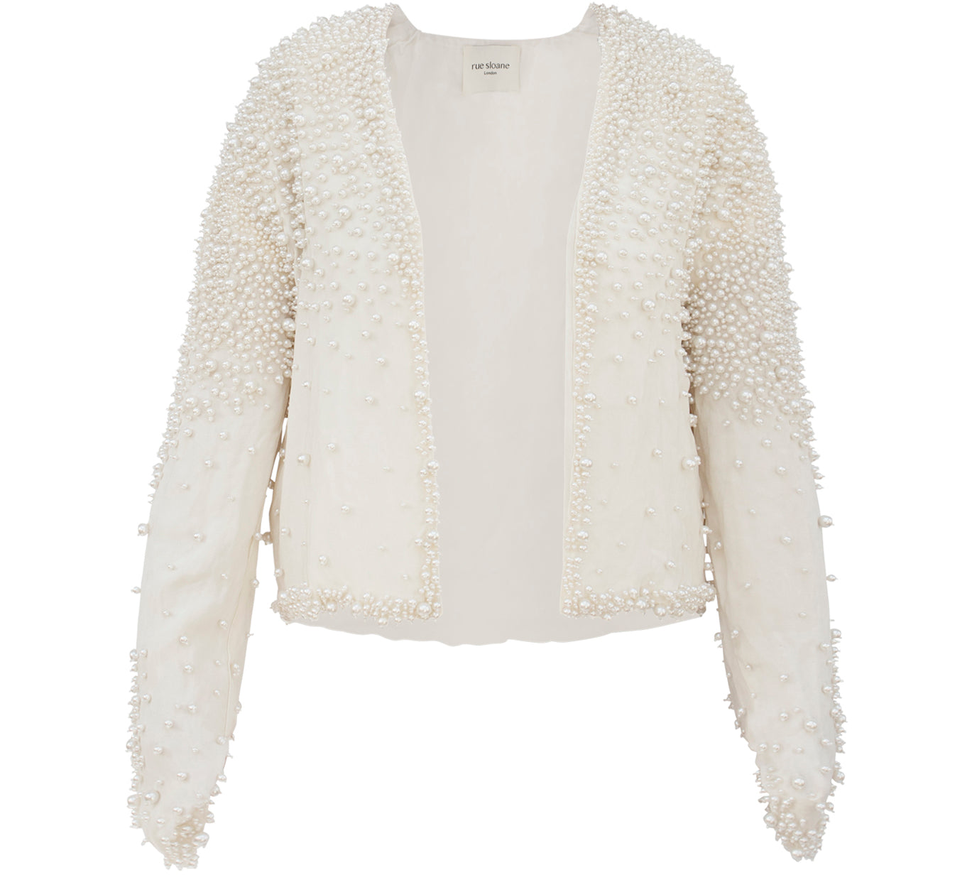 This capsule collection’s trophy piece is designed to be styled with jeans and a tee, dressed-up in the evening or as a bridal accessory. It is made from the highest quality viscose to ensure durability to hold the heavy beading with each high-quality pearl beaded by hand onto the fabric taking fives days to make. The Duster and Blouse can be styled together.