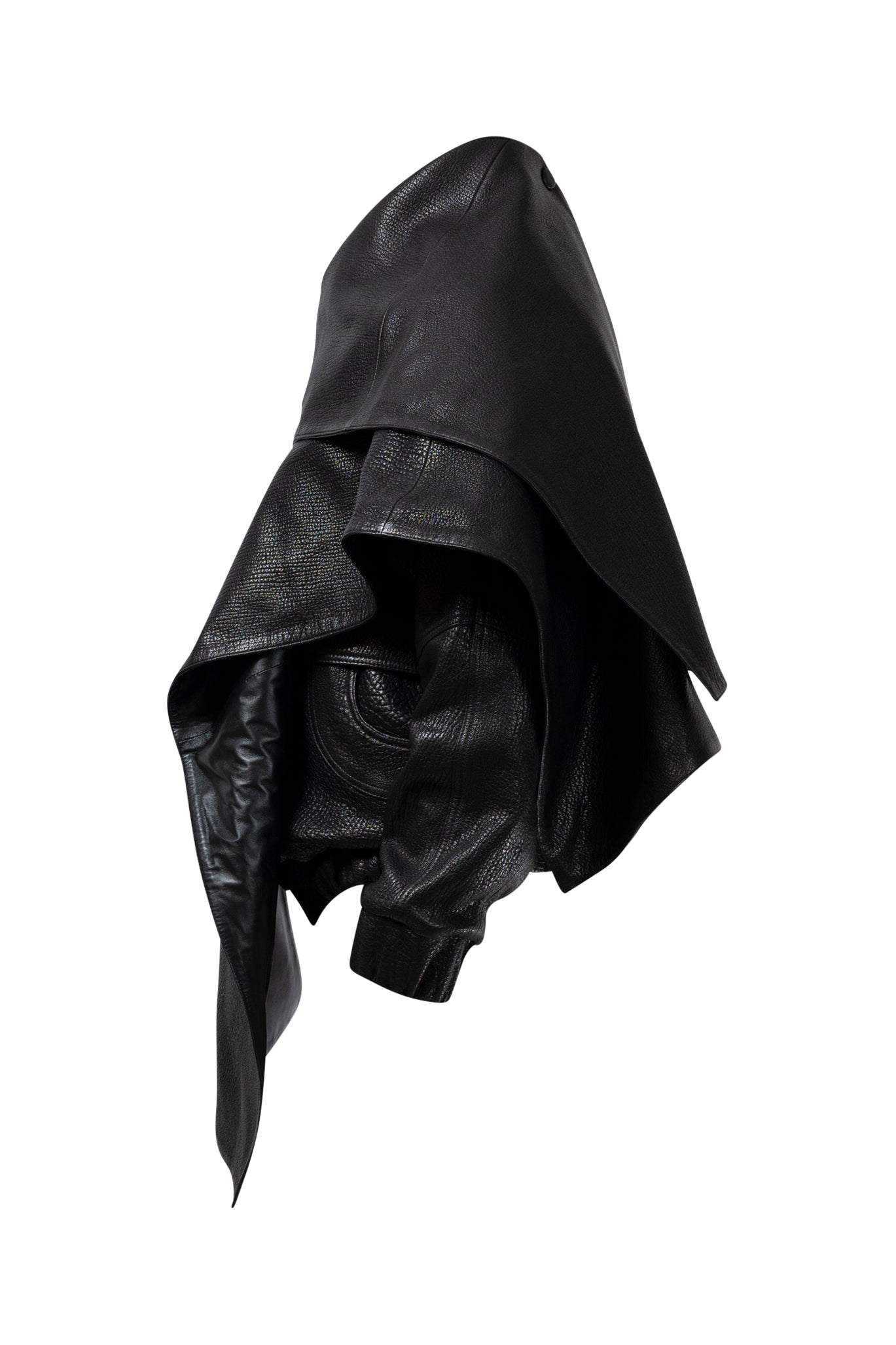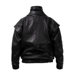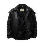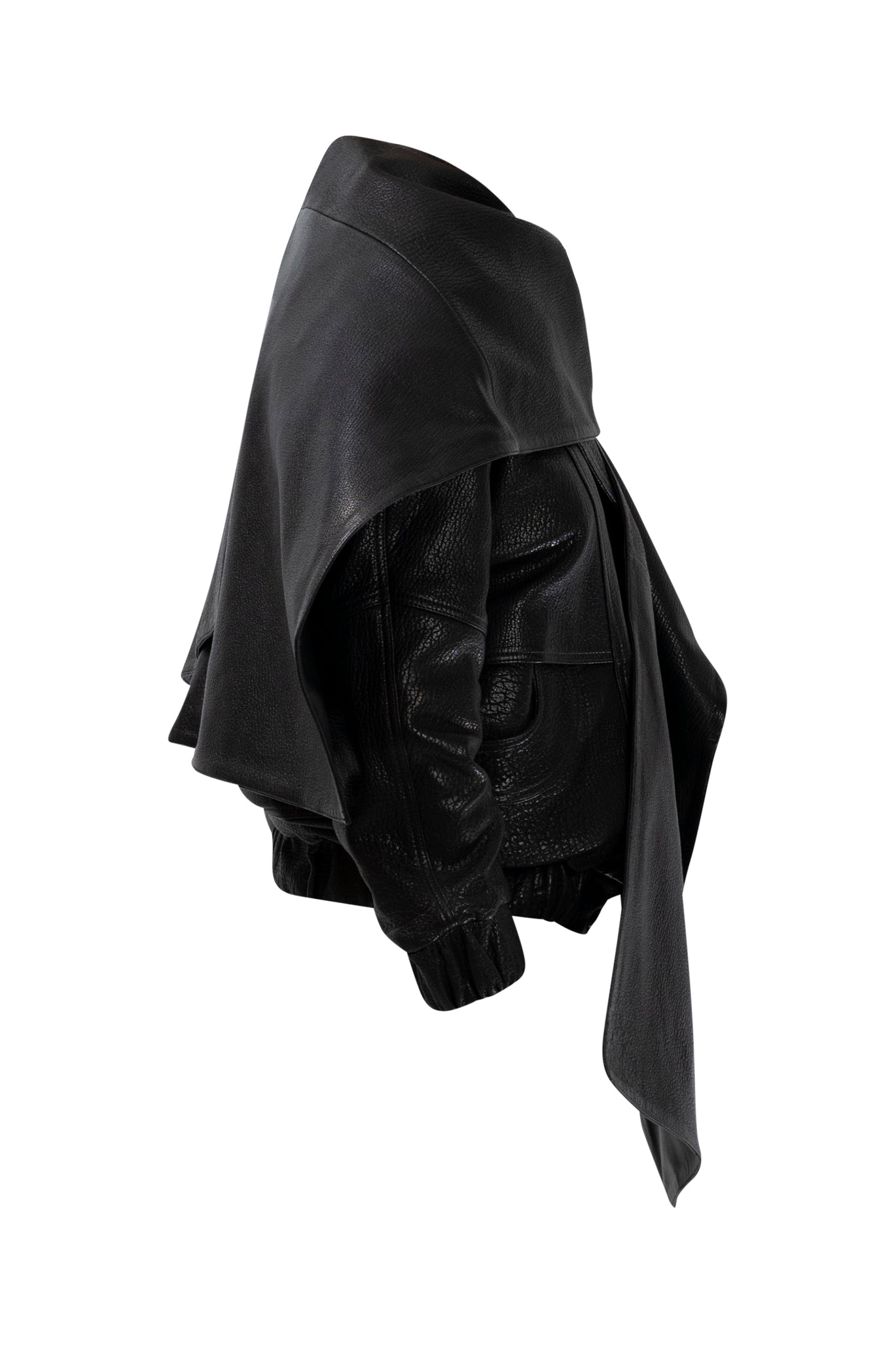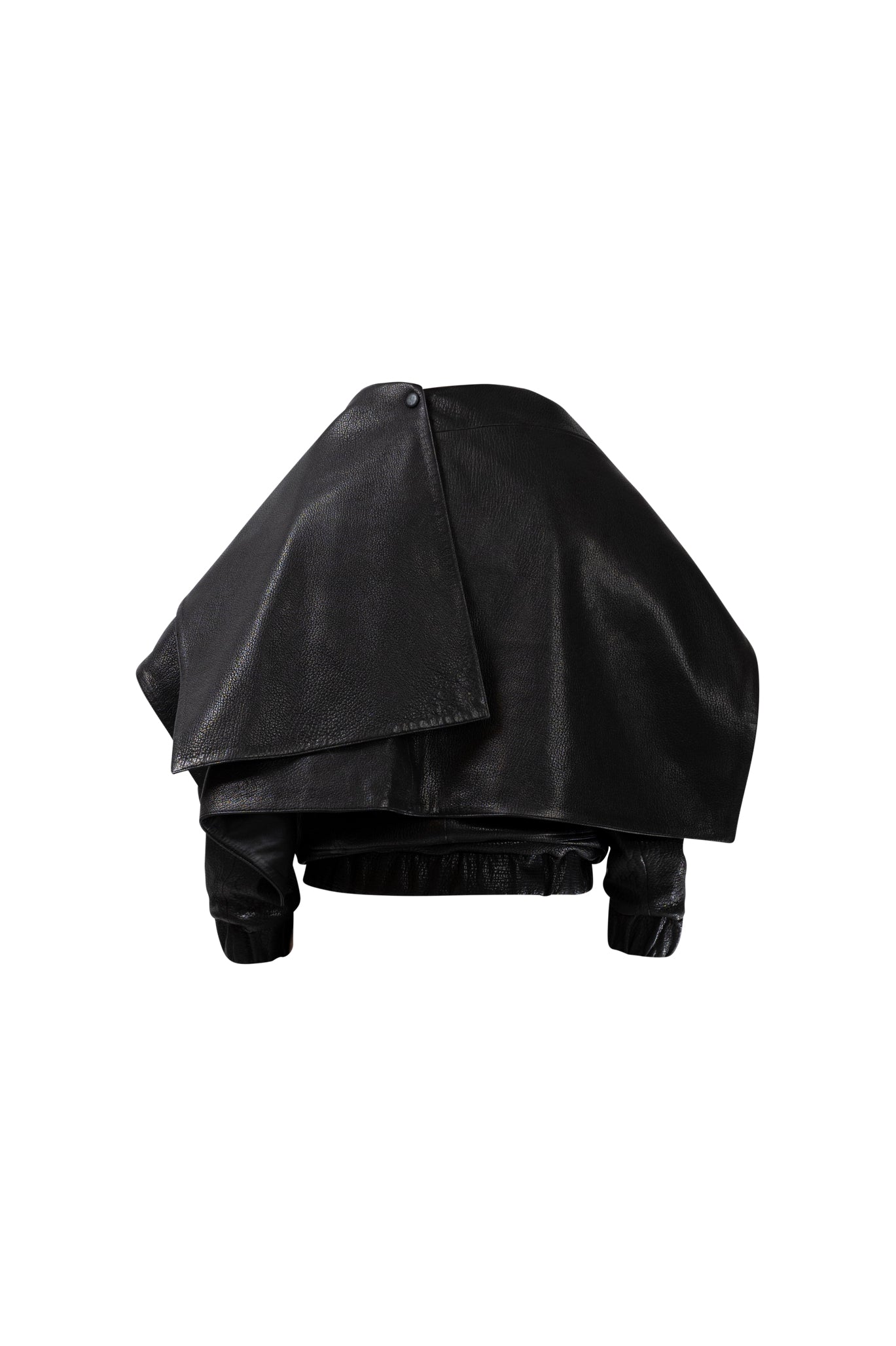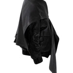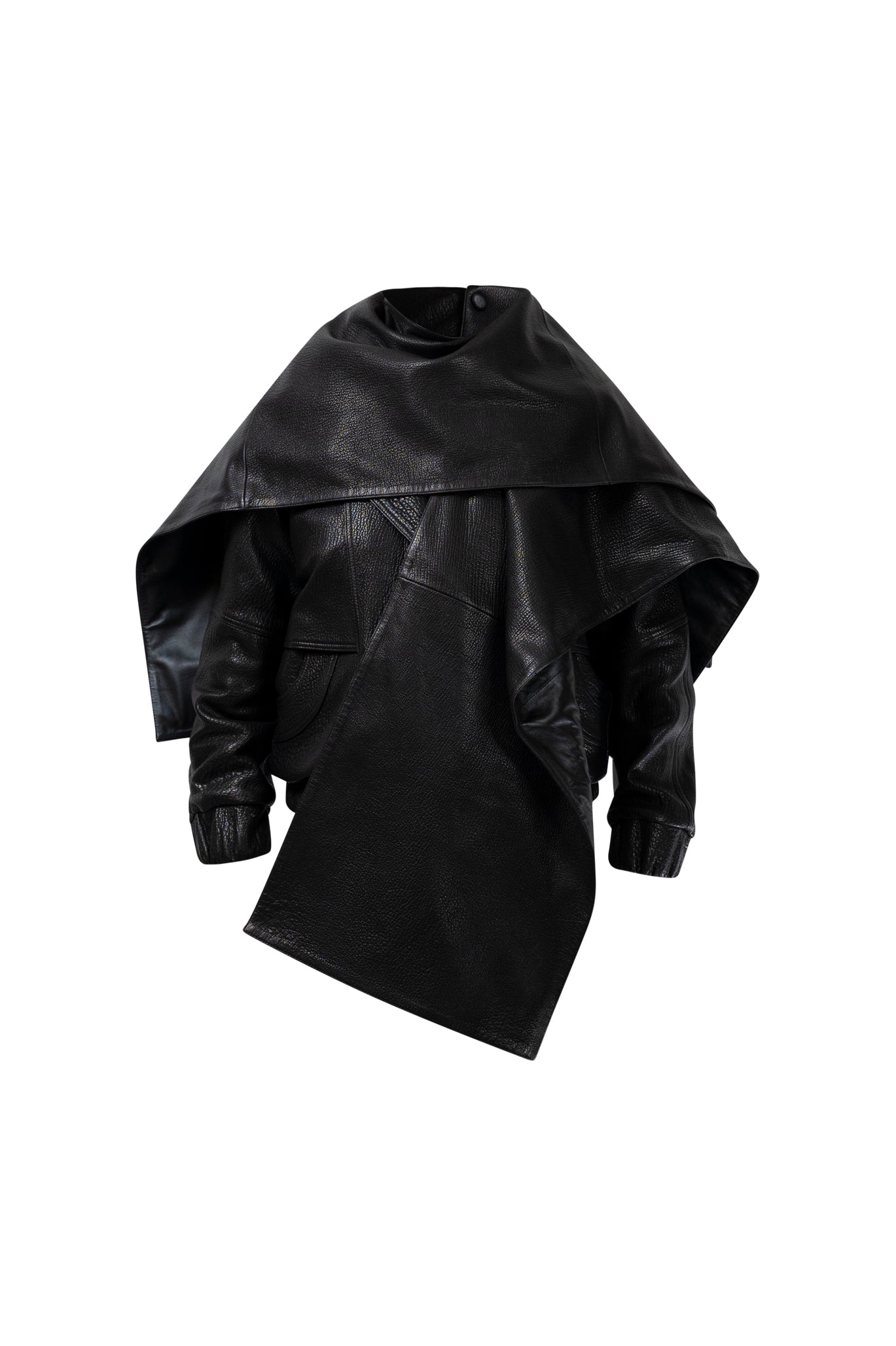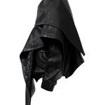 Two leather bombers in rich brown and jet black, cut in a premium, structured hide. Designed with high funnel necks, double collars, includes our signature bandana. Paired with detachable capes sold separately, one in full leather, the other in leather trimmed with shearling. These pieces are engineered for presence, bringing sharp lines and modern versatility to the season.