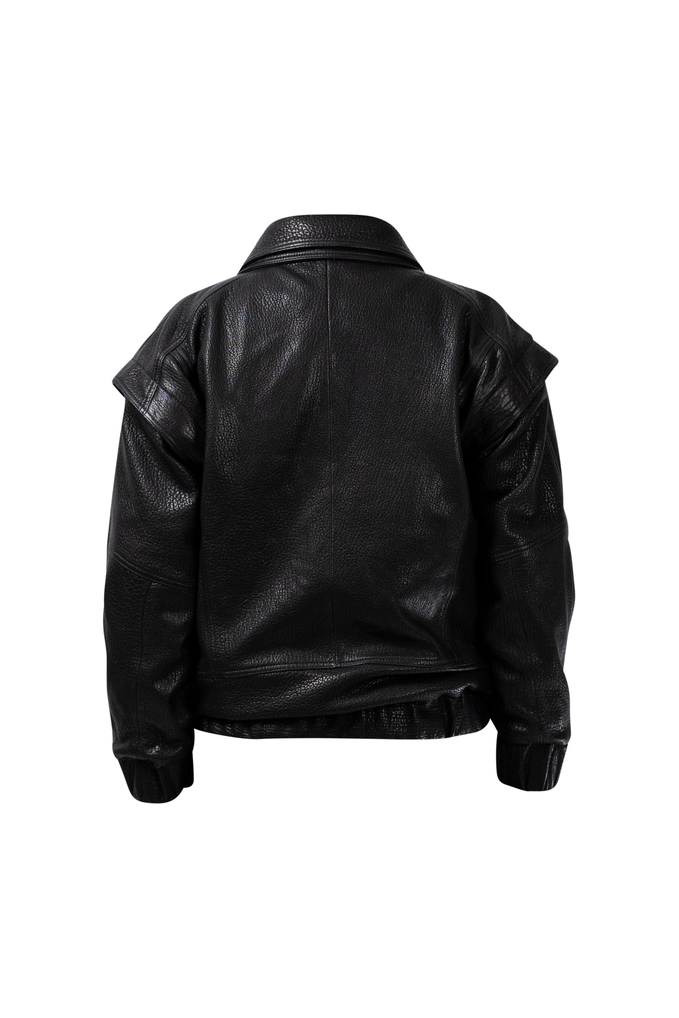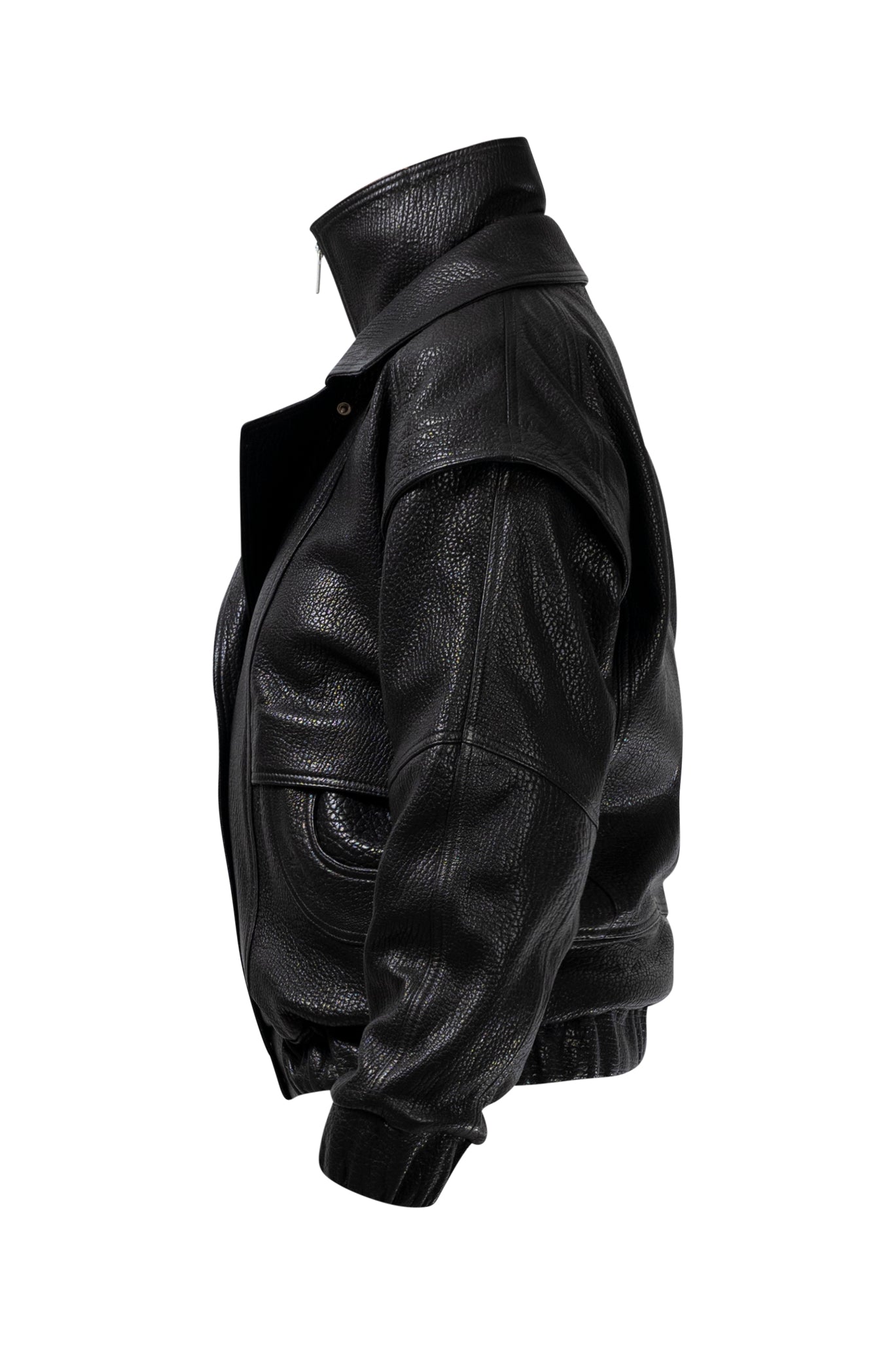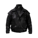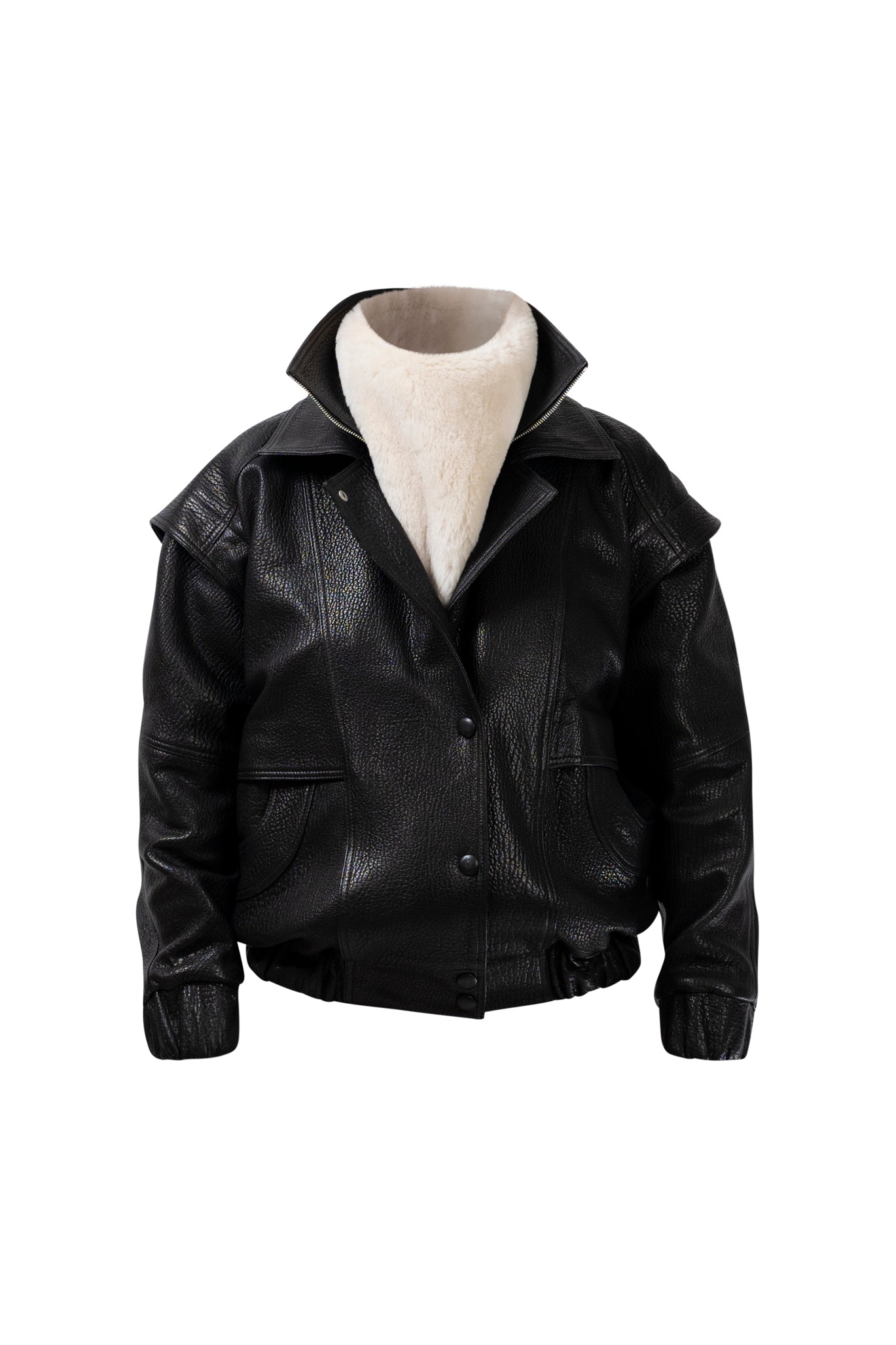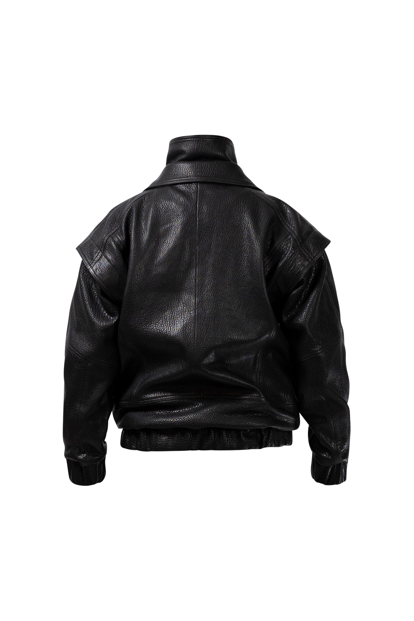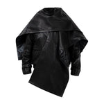 Two leather bombers in rich brown and jet black, cut in a premium, structured hide. Designed with high funnel necks, double collars, includes our signature bandana. Paired with detachable capes sold separately, one in full leather, the other in leather trimmed with shearling. These pieces are engineered for presence, bringing sharp lines and modern versatility to the season.