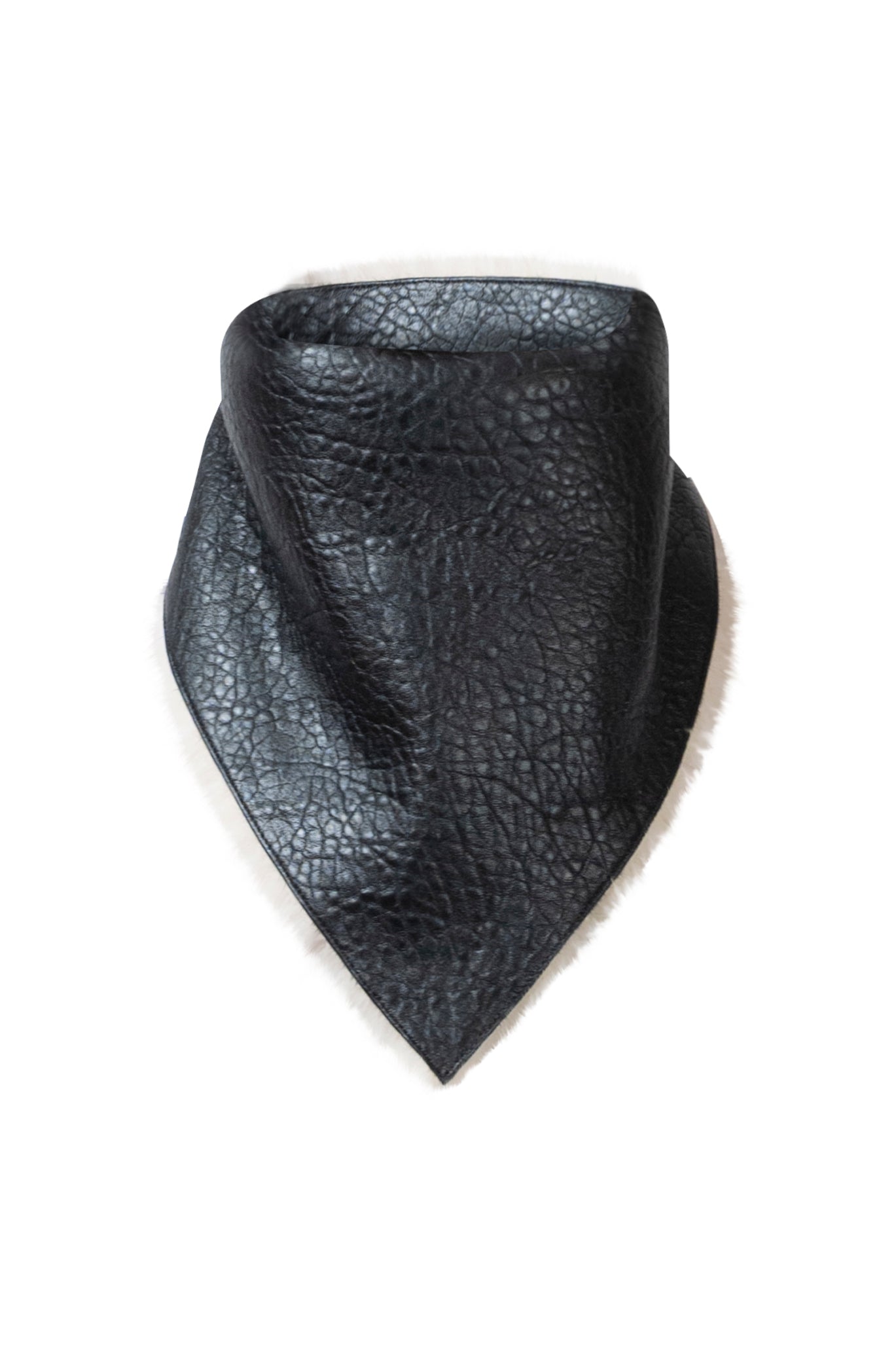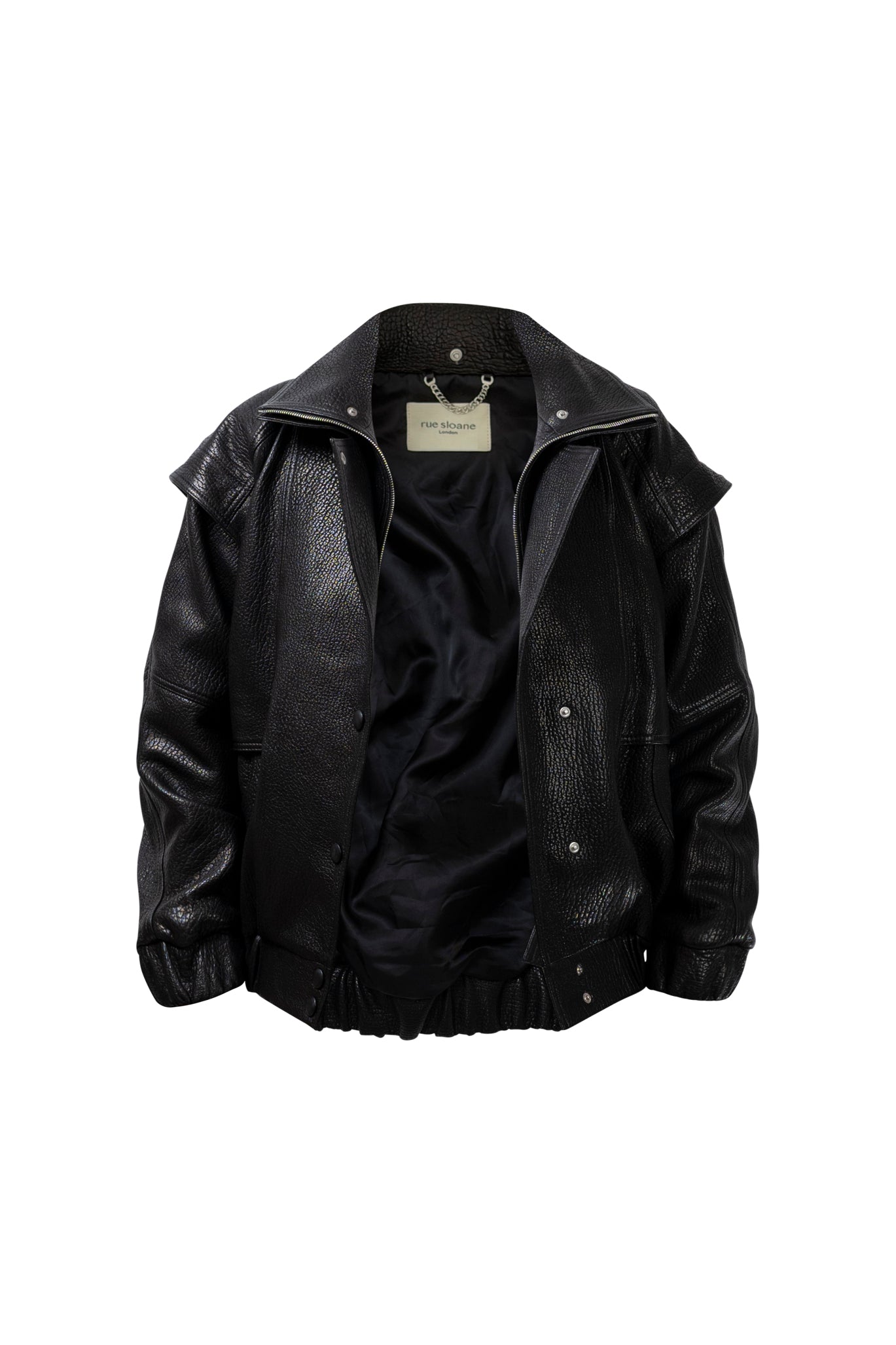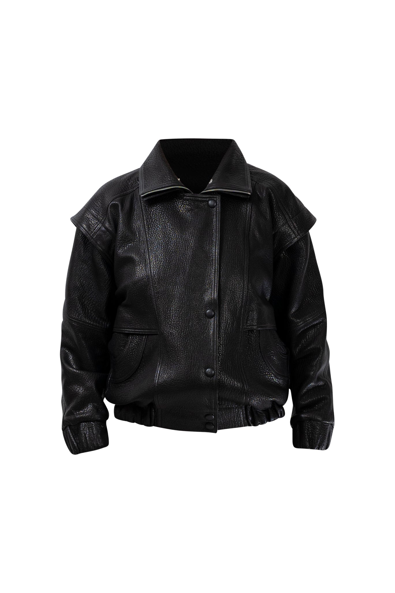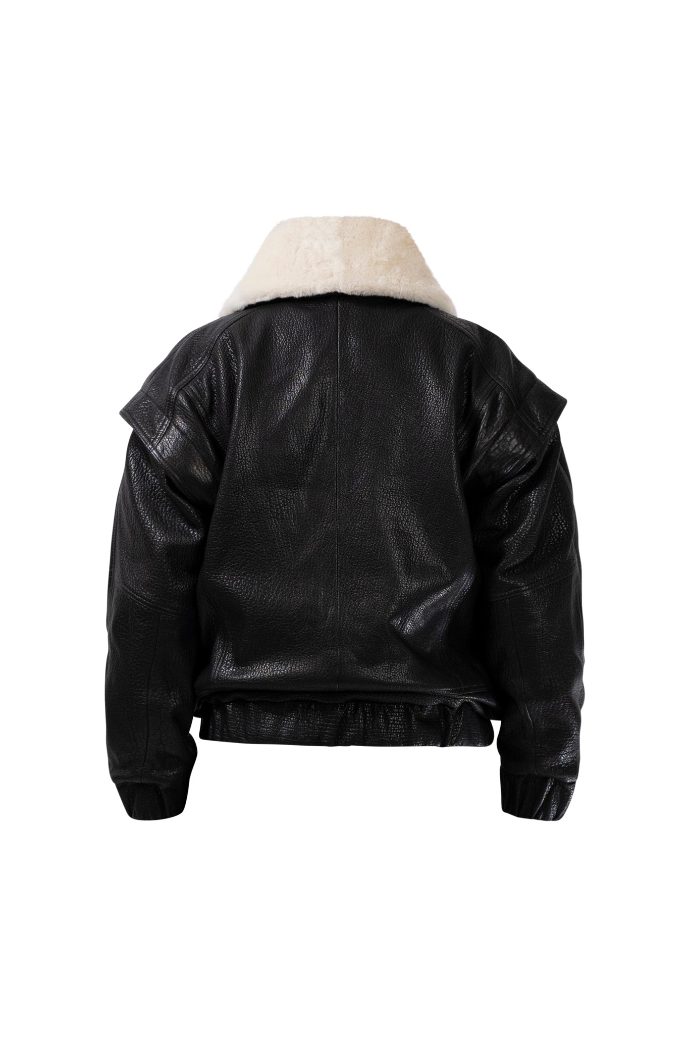 Two leather bombers in rich brown and jet black, cut in a premium, structured hide. Designed with high funnel necks, double collars, includes our signature bandana. Paired with detachable capes sold separately, one in full leather, the other in leather trimmed with shearling. These pieces are engineered for presence, bringing sharp lines and modern versatility to the season.