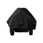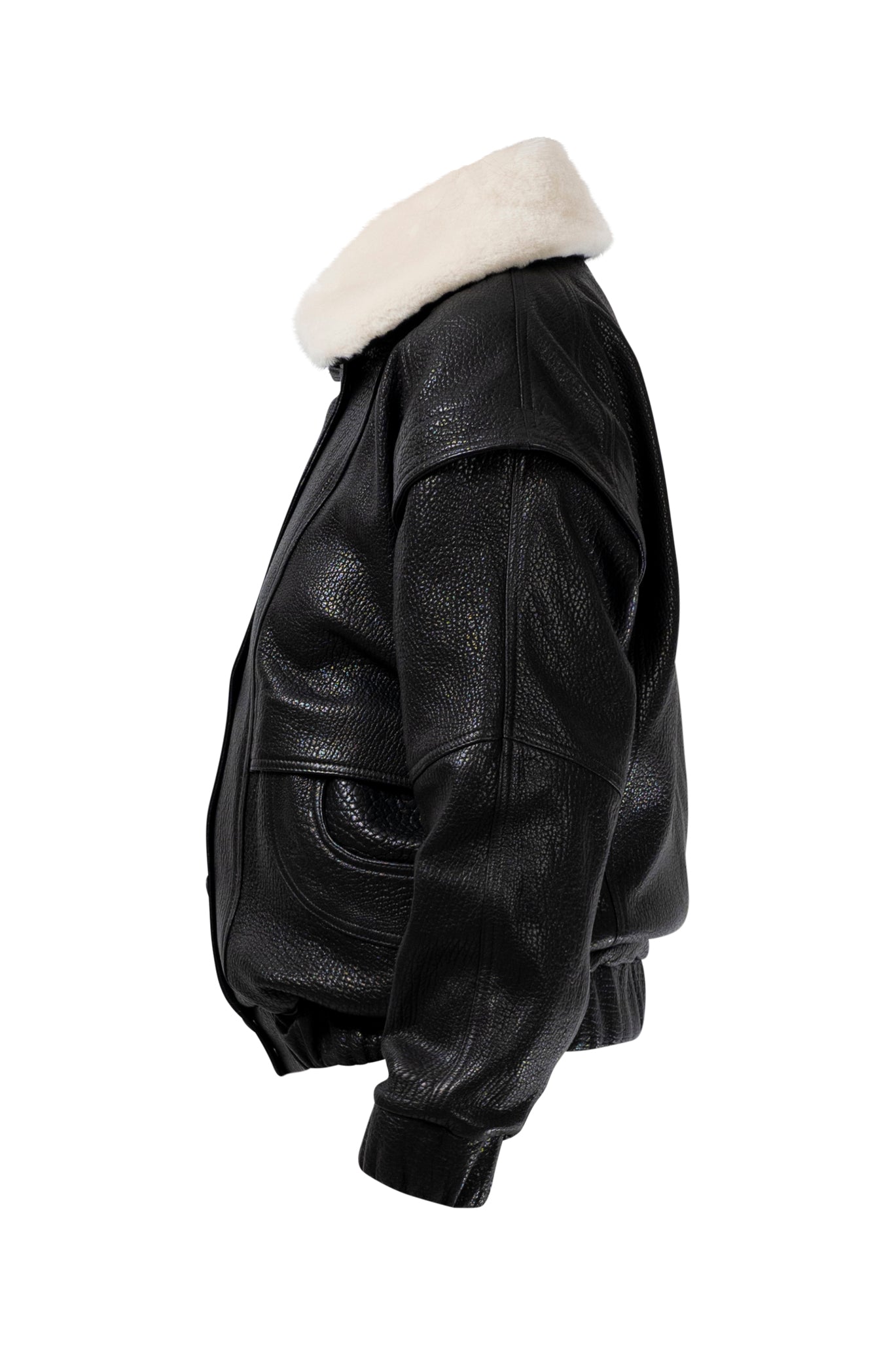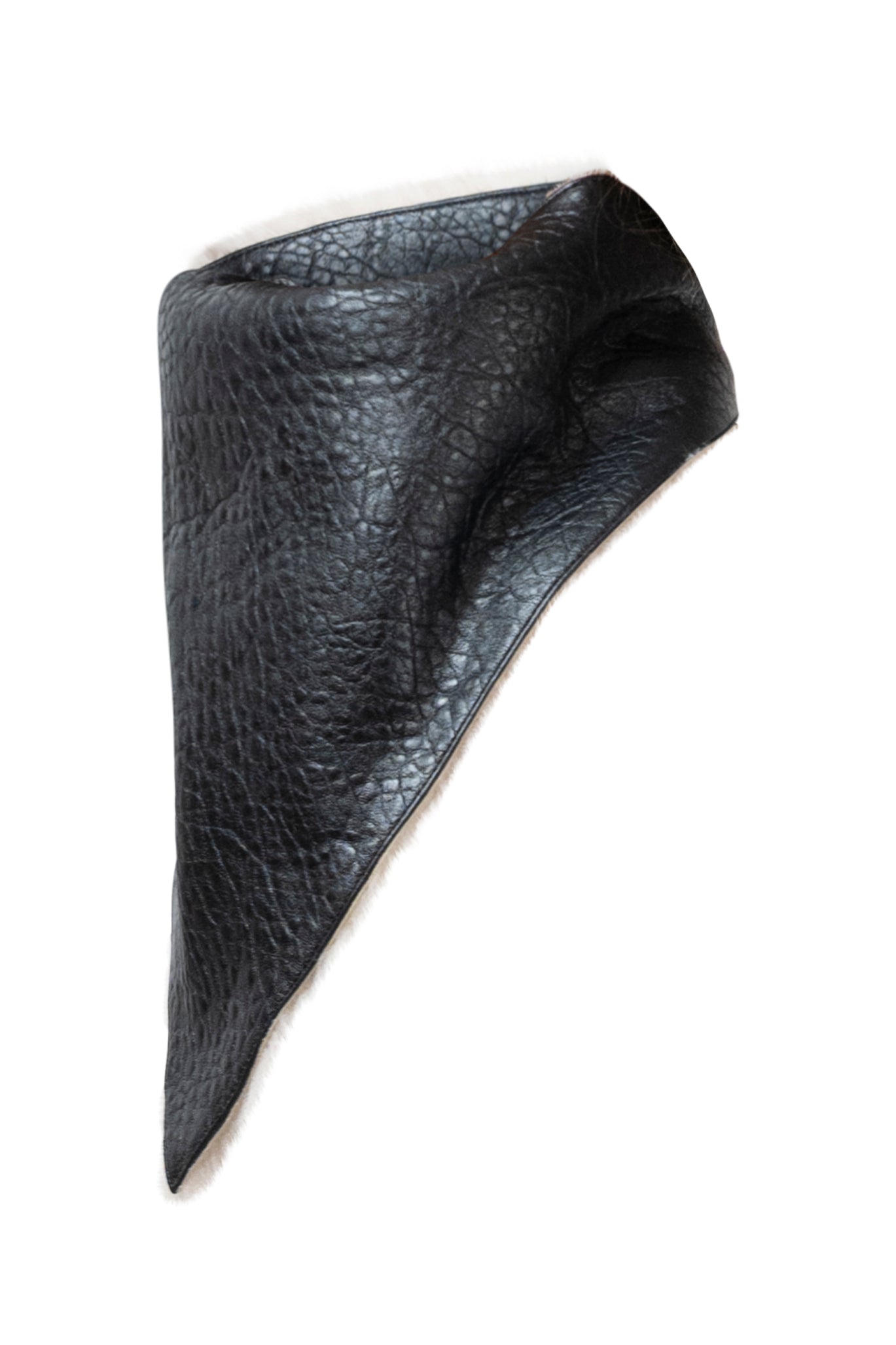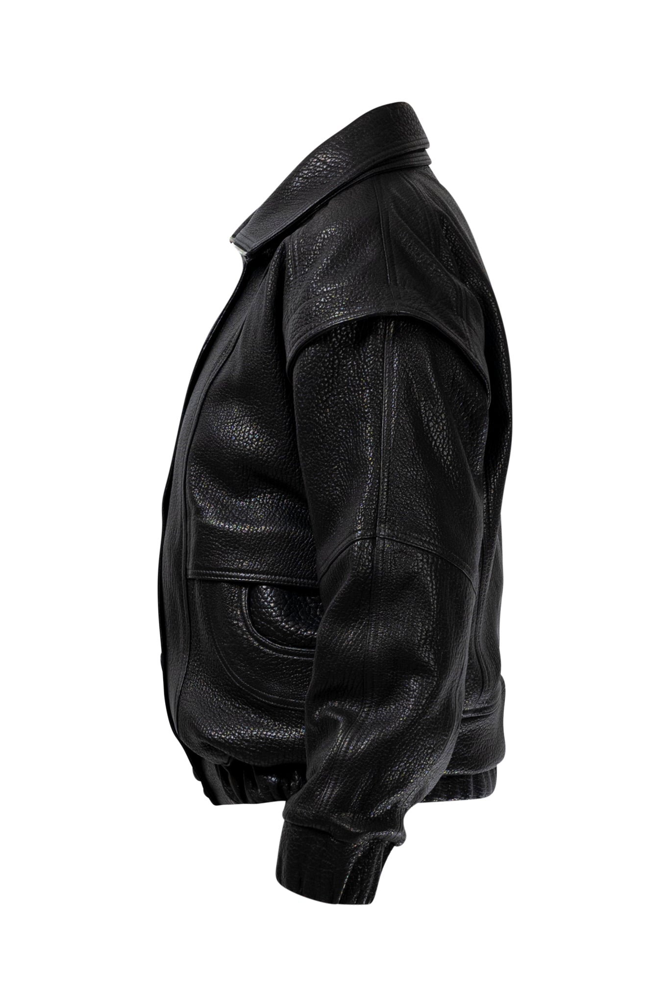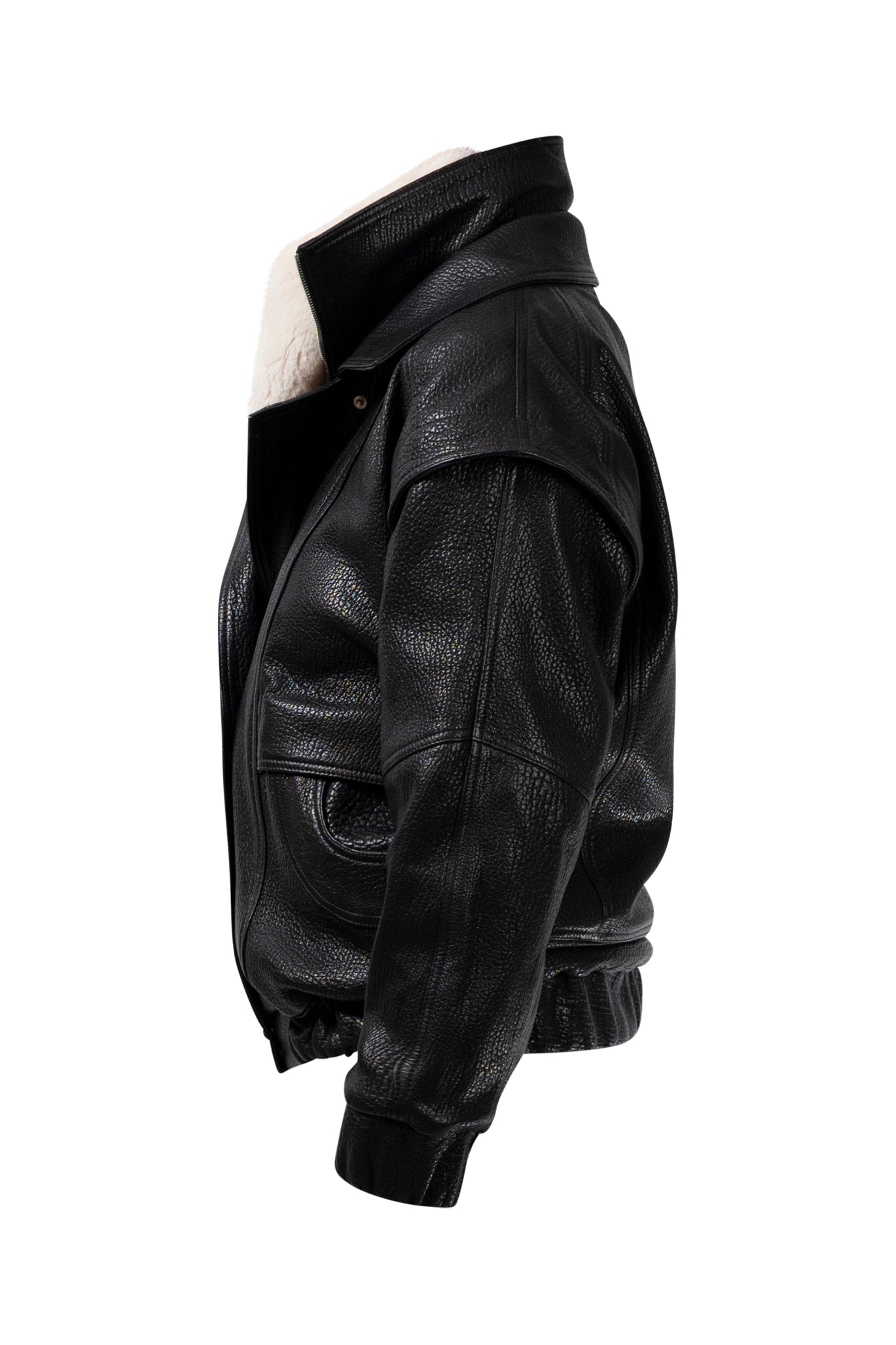 Two leather bombers in rich brown and jet black, cut in a premium, structured hide. Designed with high funnel necks, double collars, includes our signature bandana. Paired with detachable capes sold separately, one in full leather, the other in leather trimmed with shearling. These pieces are engineered for presence, bringing sharp lines and modern versatility to the season.