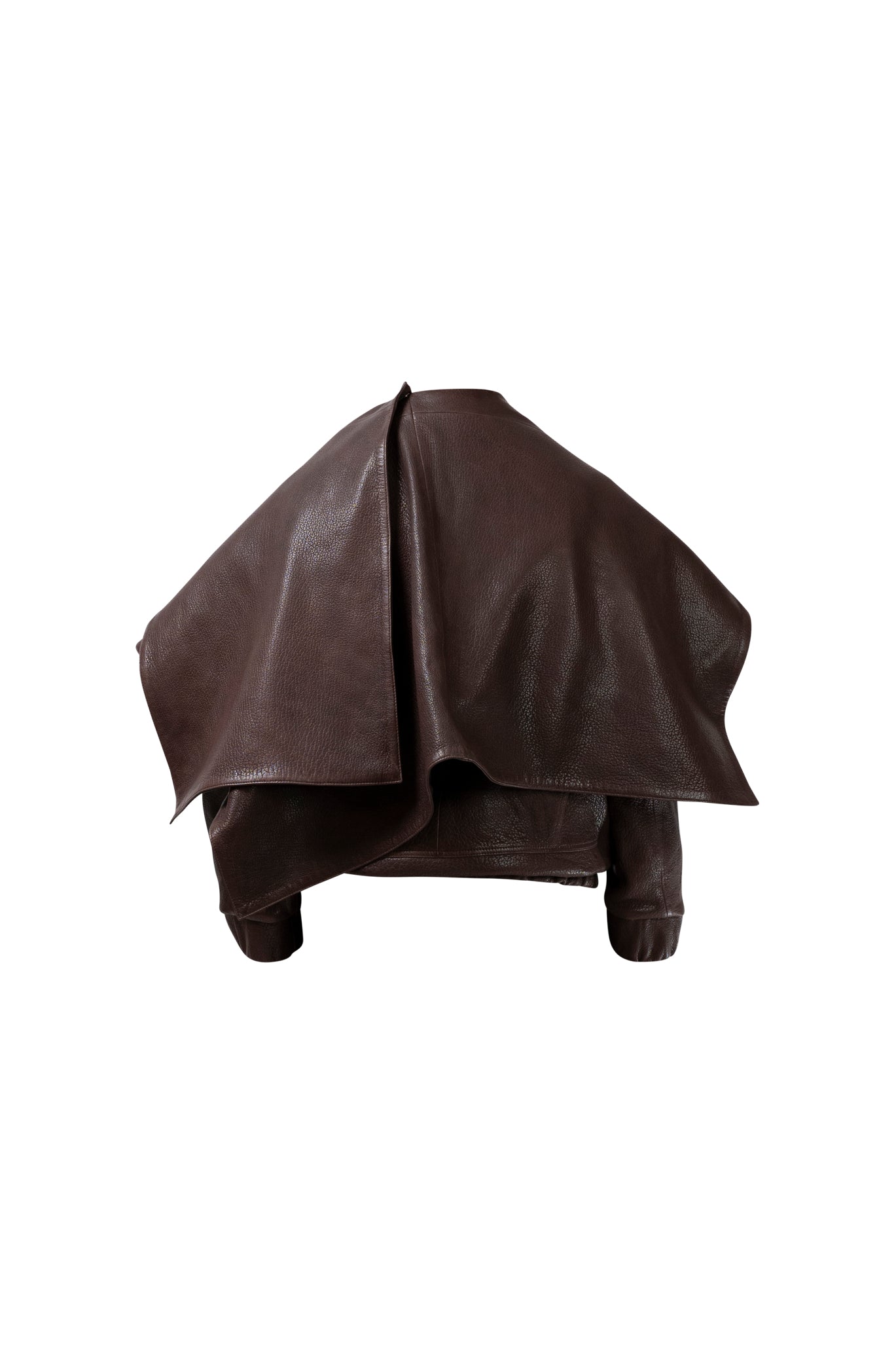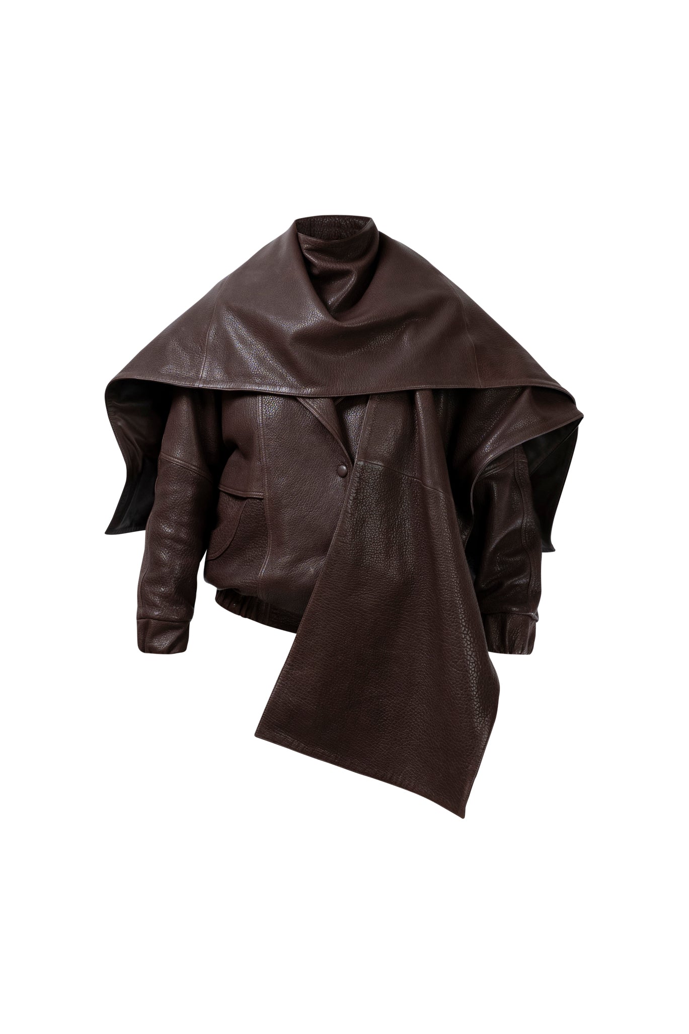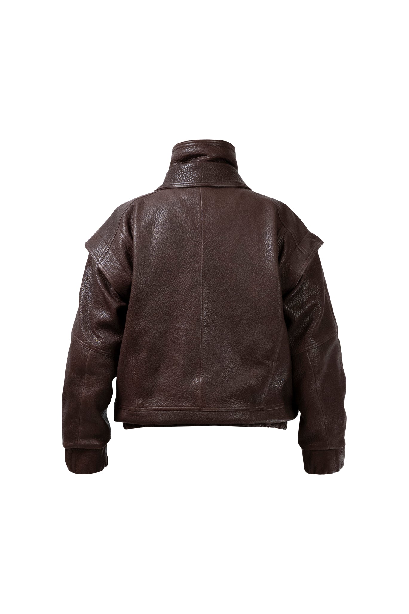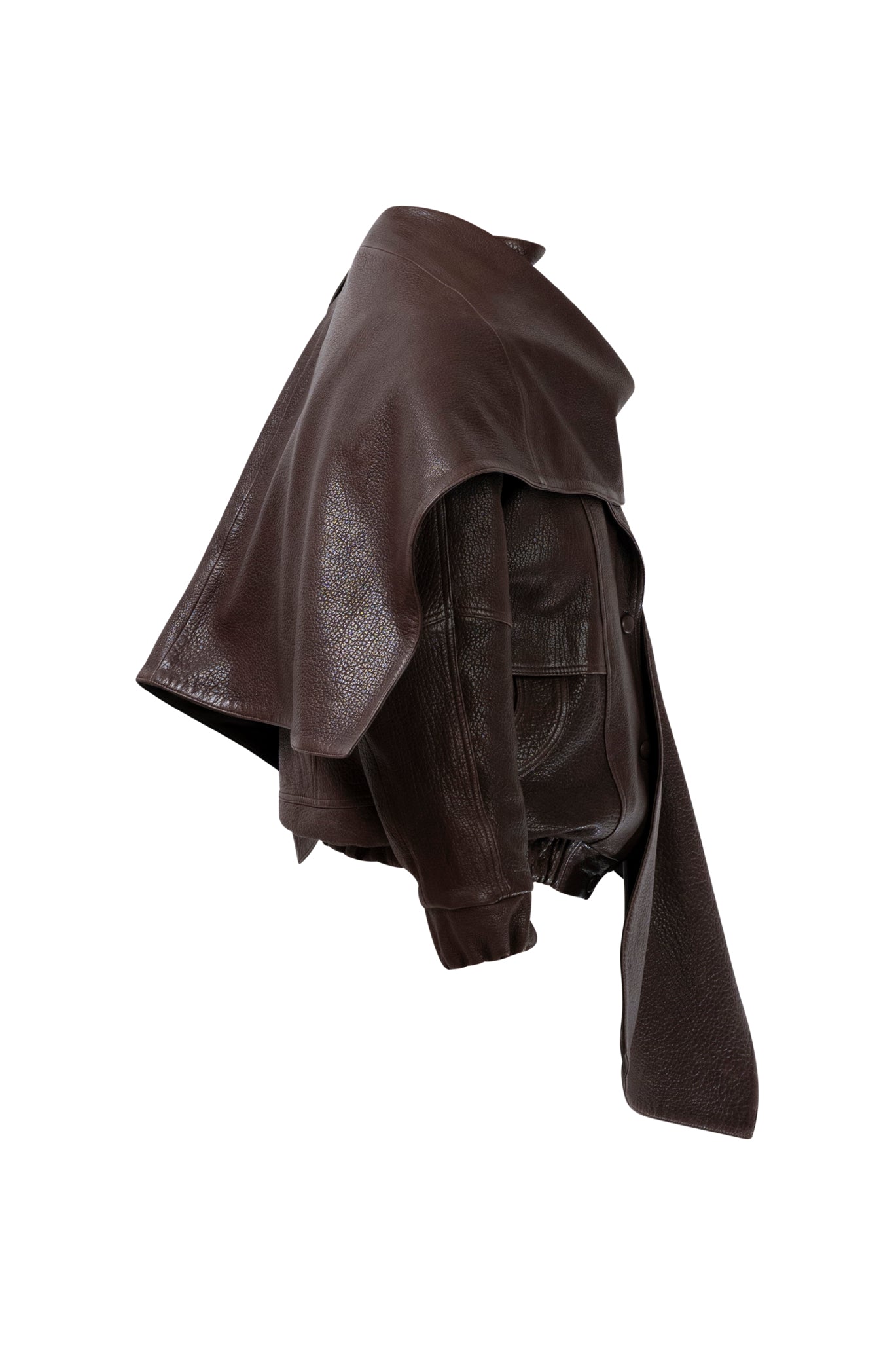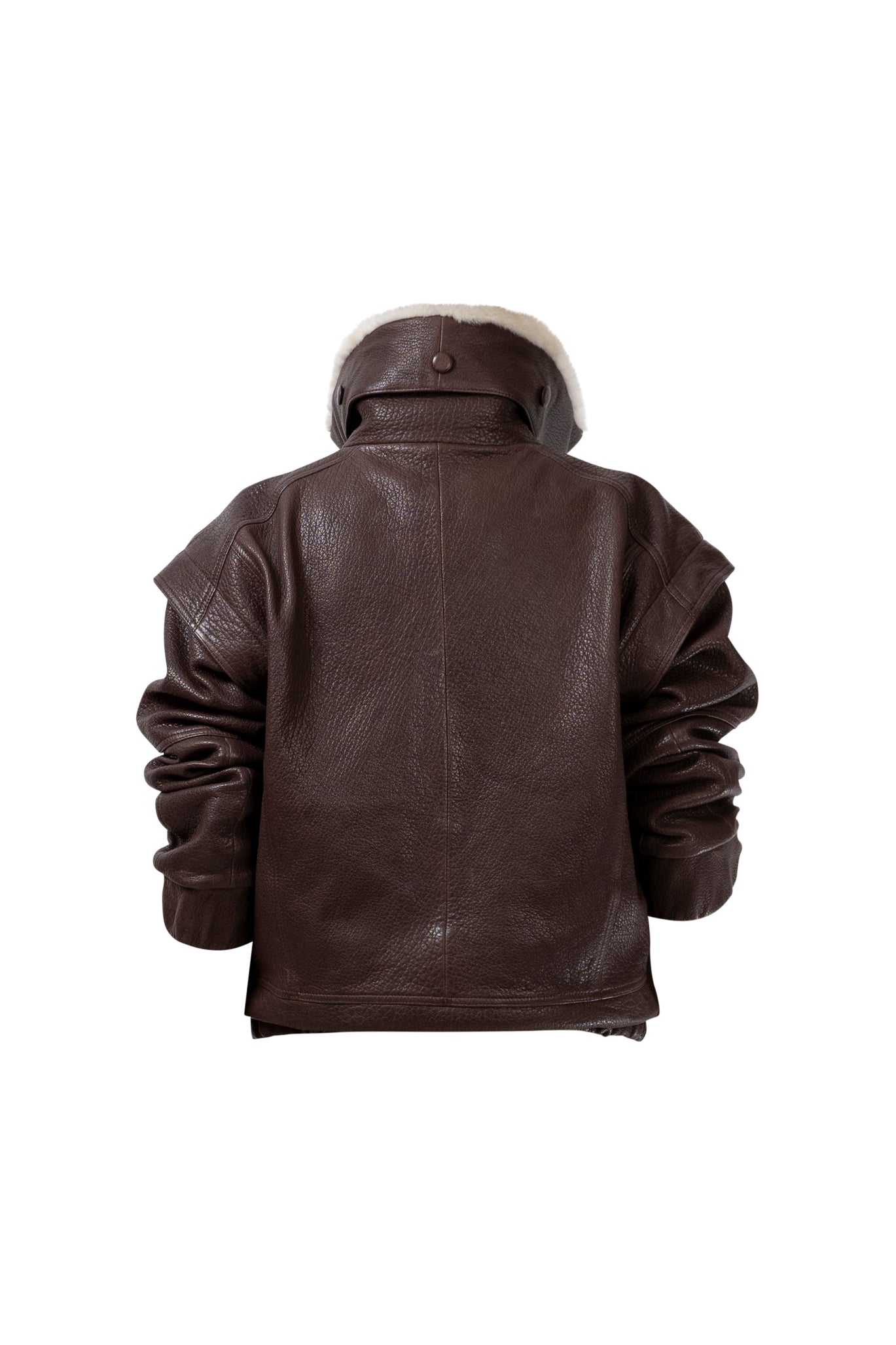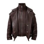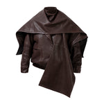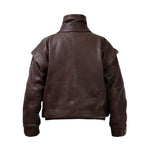 Leather bomber available in rich brown, jet black and navy, cut in a premium, structured hide. Designed with high funnel necks, double collars, includes our signature bandana. Paired with detachable capes sold separately, one in full leather, the other in leather trimmed with shearling. These pieces are engineered for presence, bringing sharp lines and modern versatility to the season.