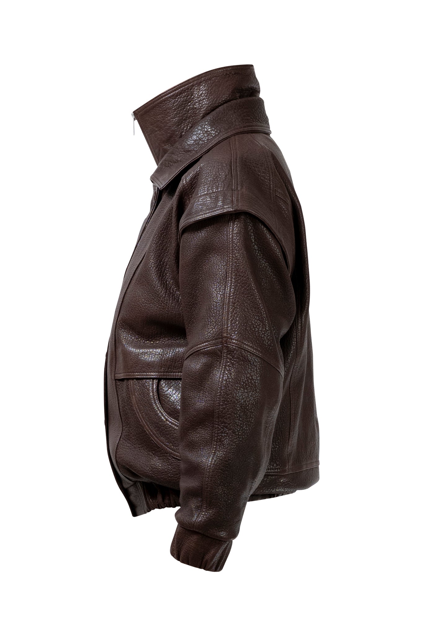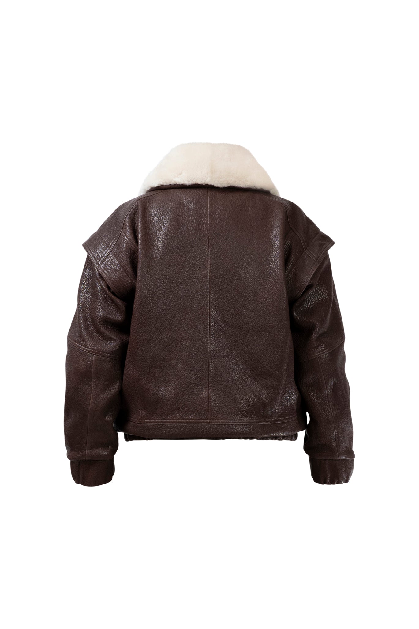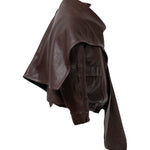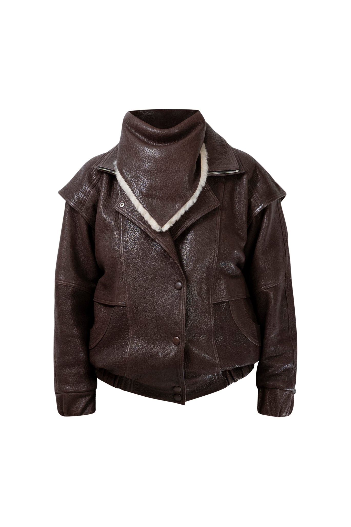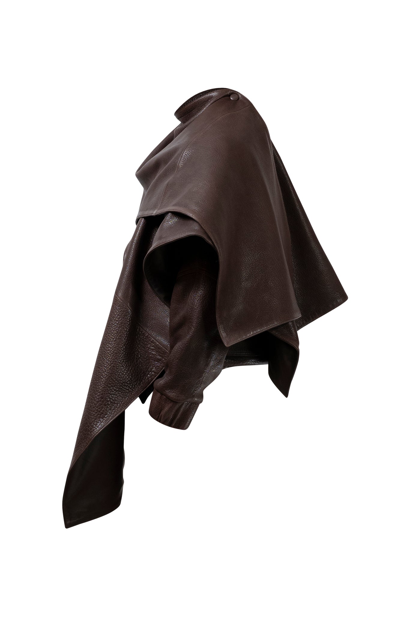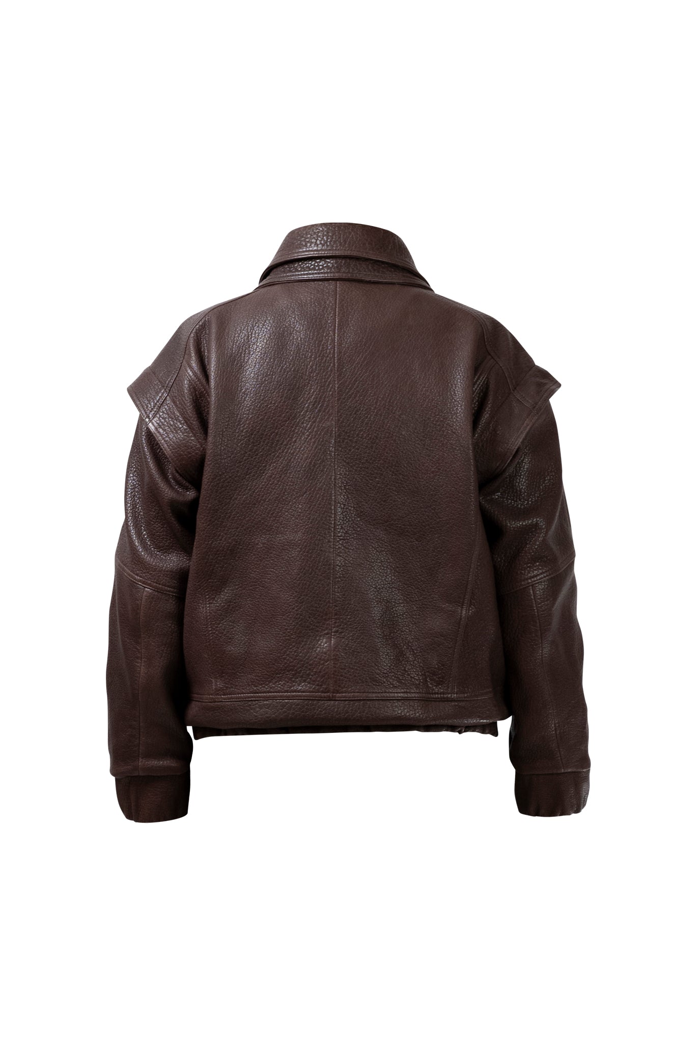 Leather bomber available in rich brown, jet black and navy, cut in a premium, structured hide. Designed with high funnel necks, double collars, includes our signature bandana. Paired with detachable capes sold separately, one in full leather, the other in leather trimmed with shearling. These pieces are engineered for presence, bringing sharp lines and modern versatility to the season.