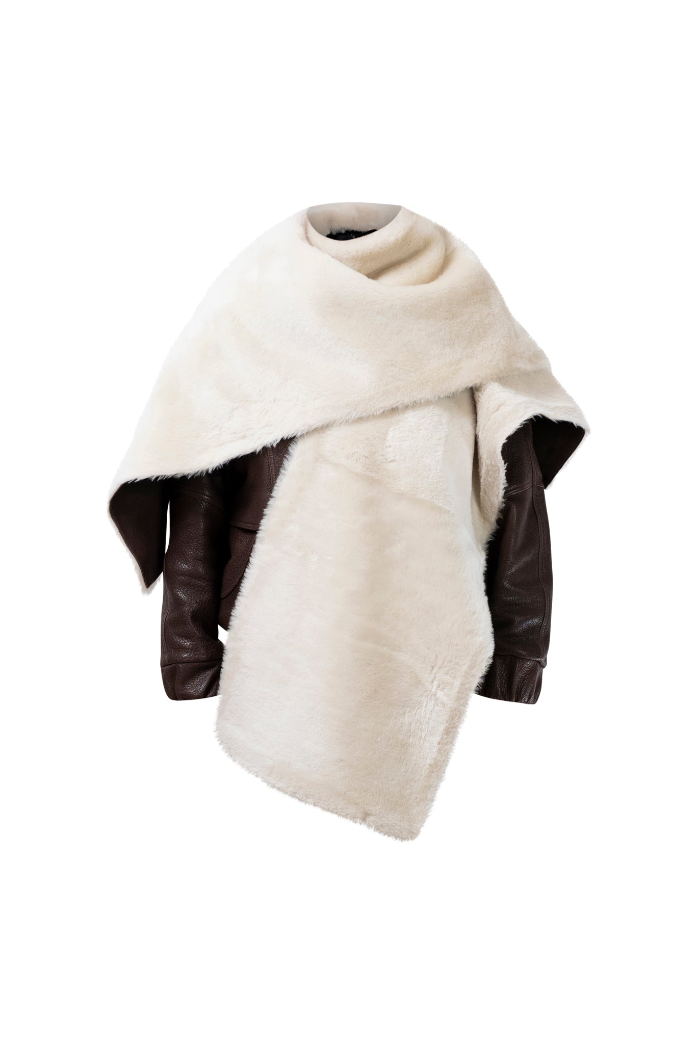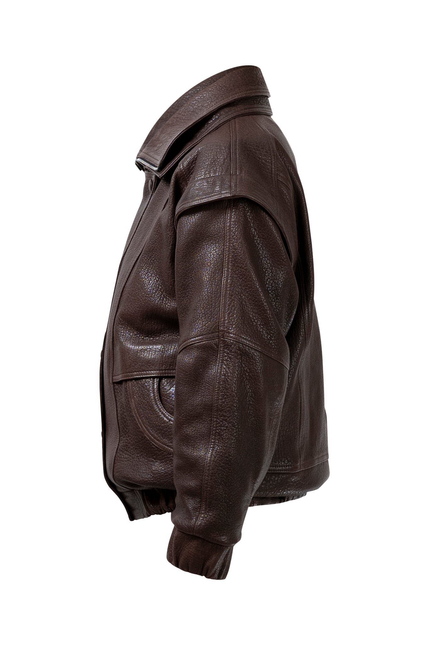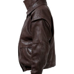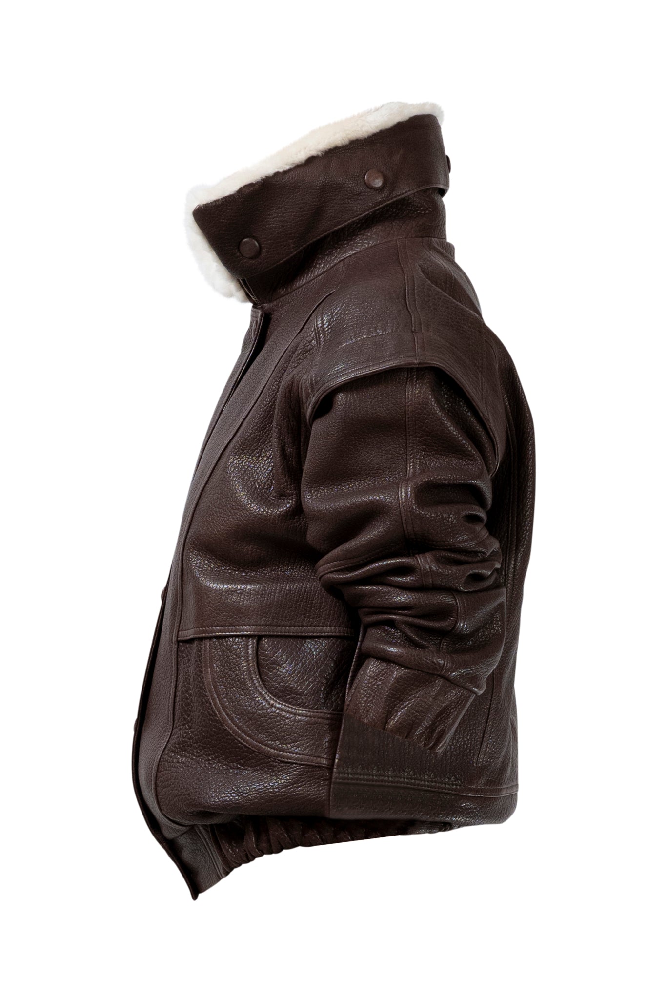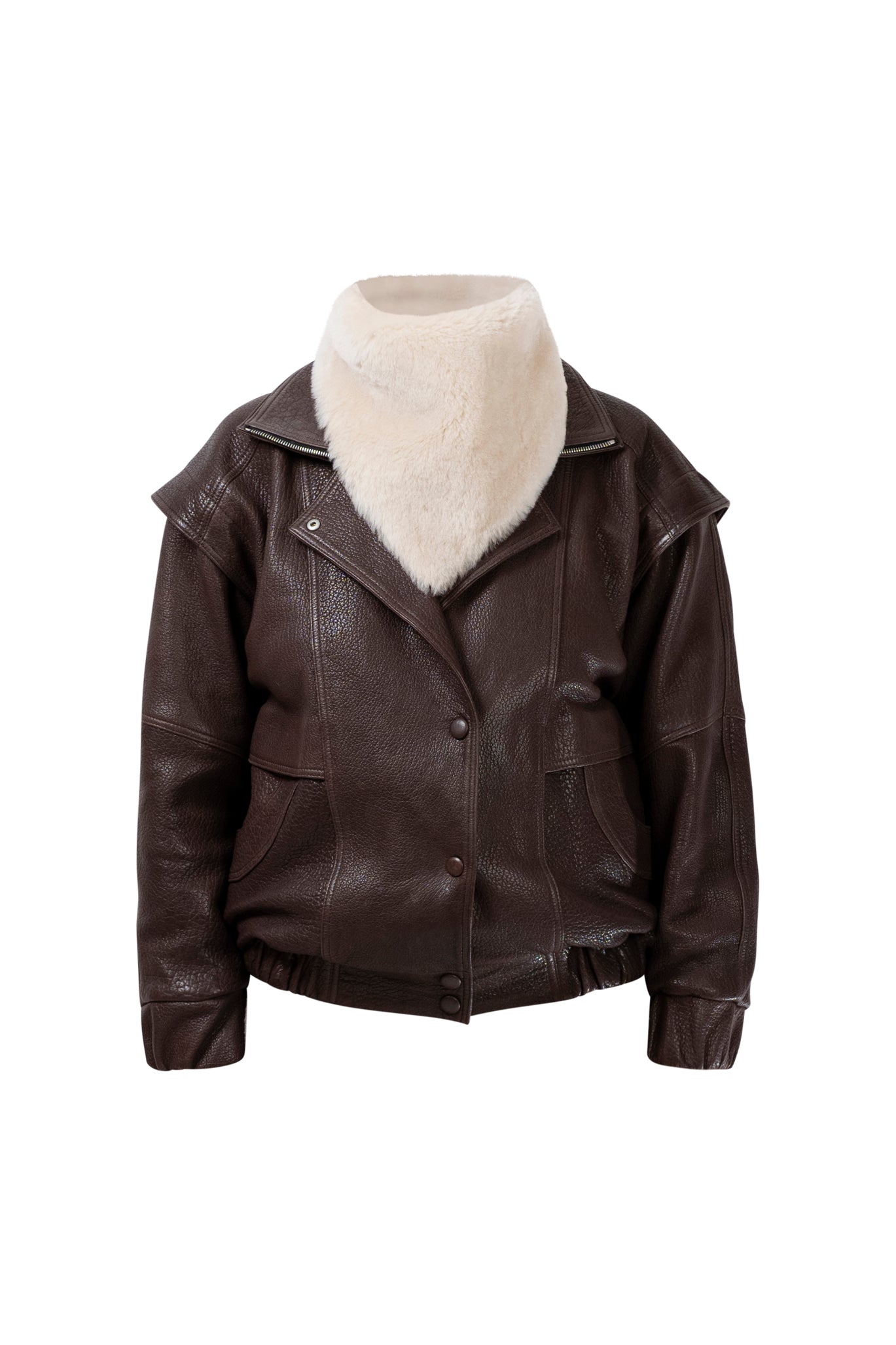 Leather bomber available in rich brown, jet black and navy, cut in a premium, structured hide. Designed with high funnel necks, double collars, includes our signature bandana. Paired with detachable capes sold separately, one in full leather, the other in leather trimmed with shearling. These pieces are engineered for presence, bringing sharp lines and modern versatility to the season.