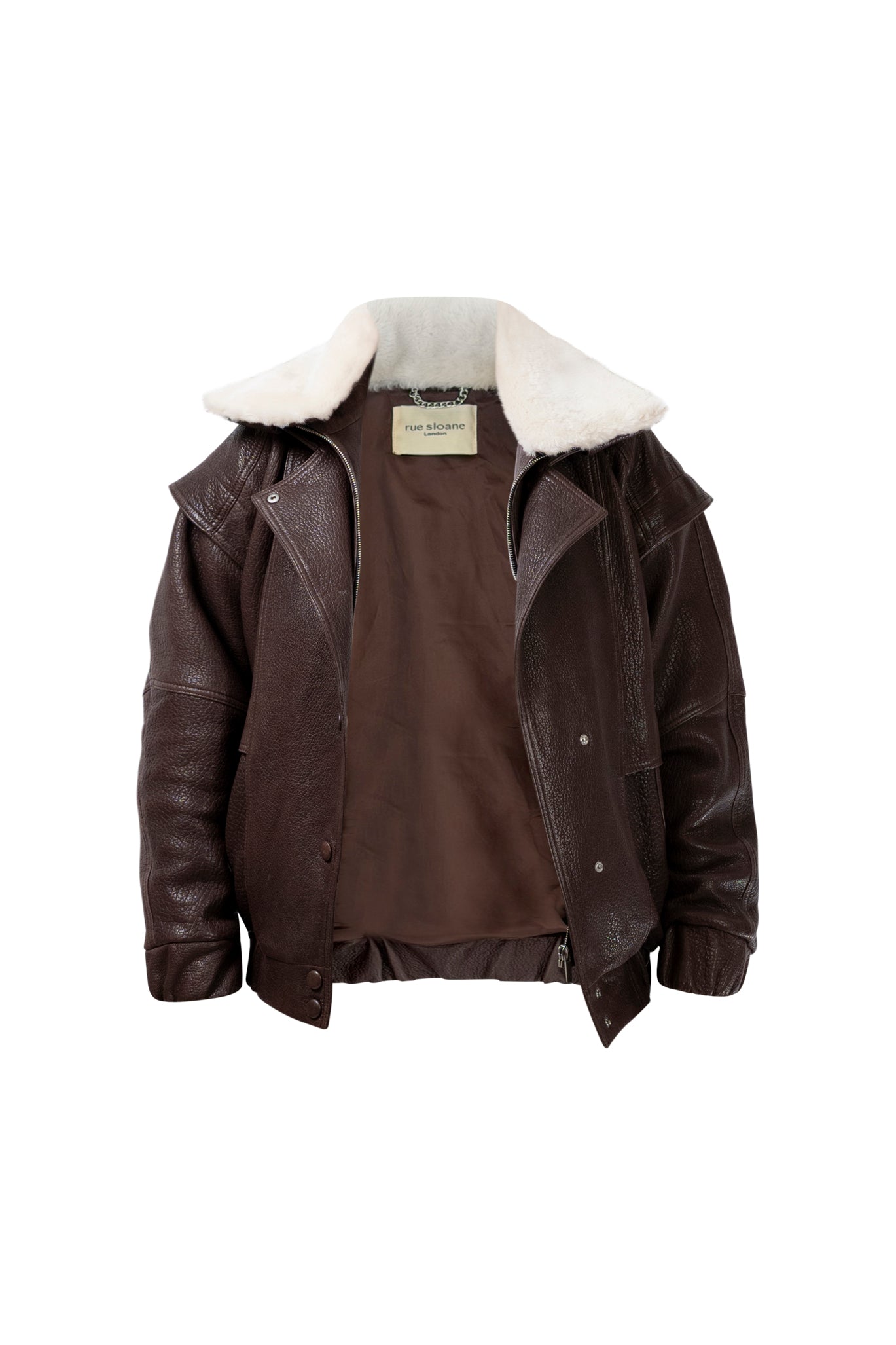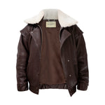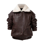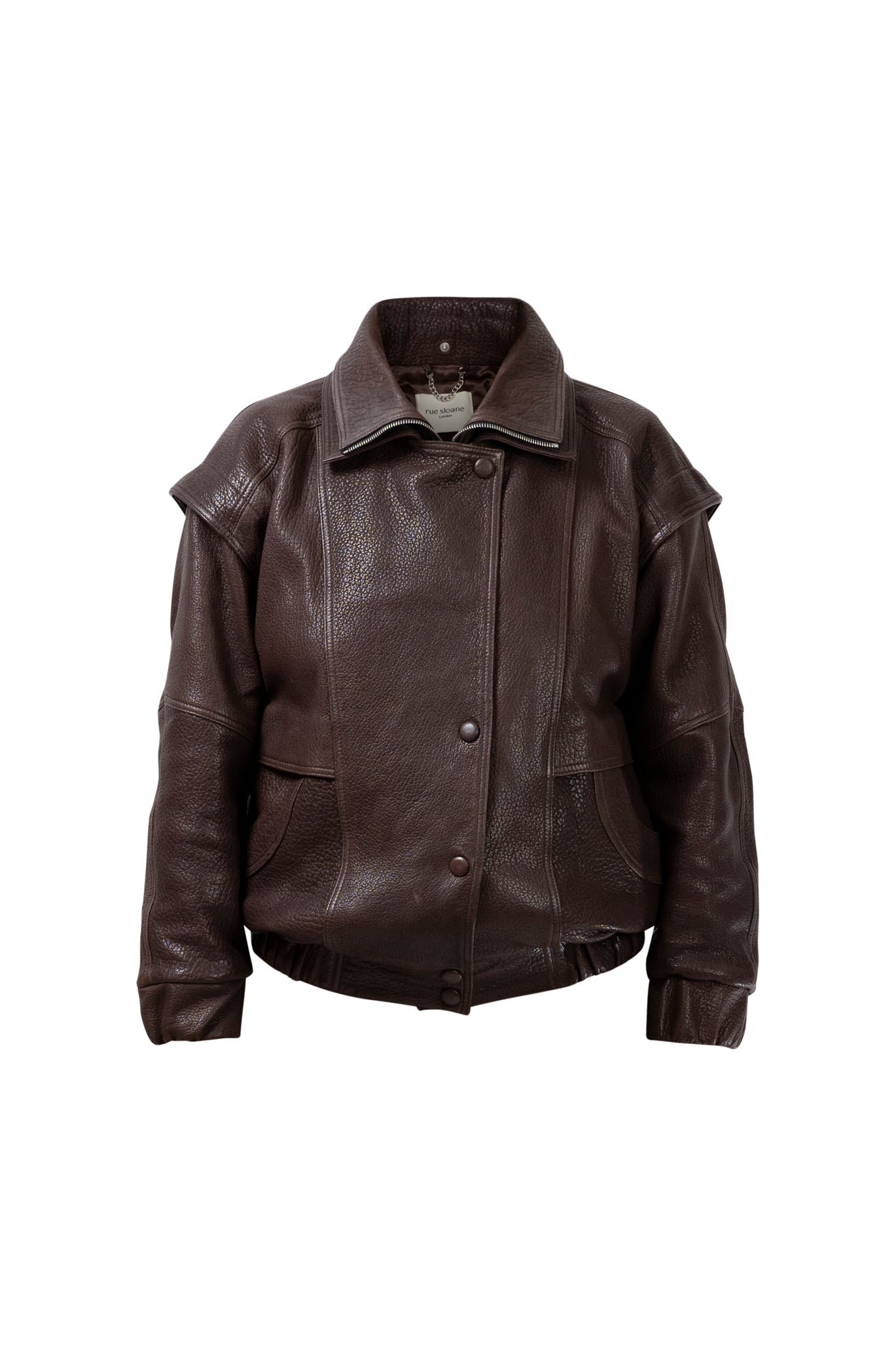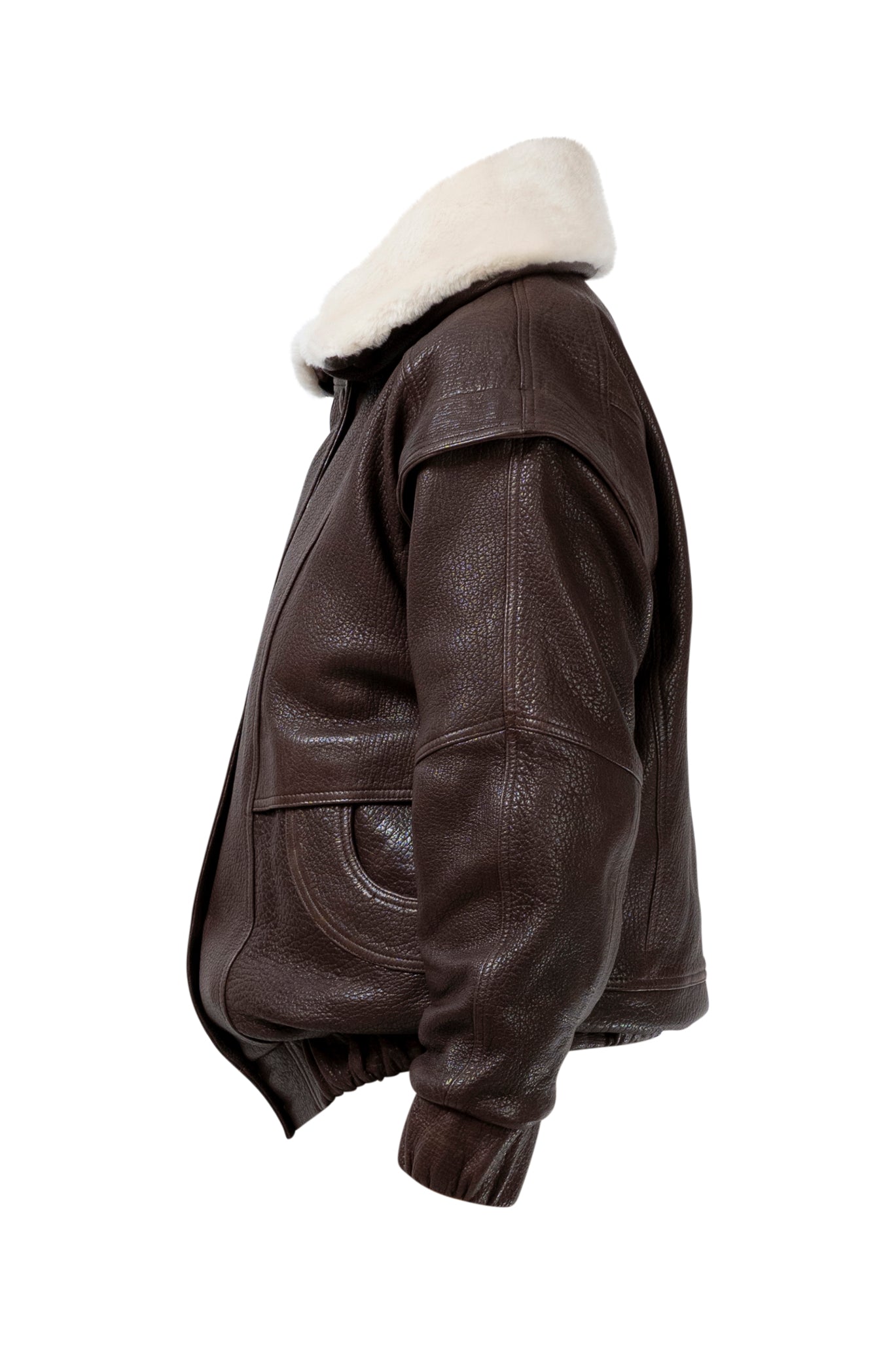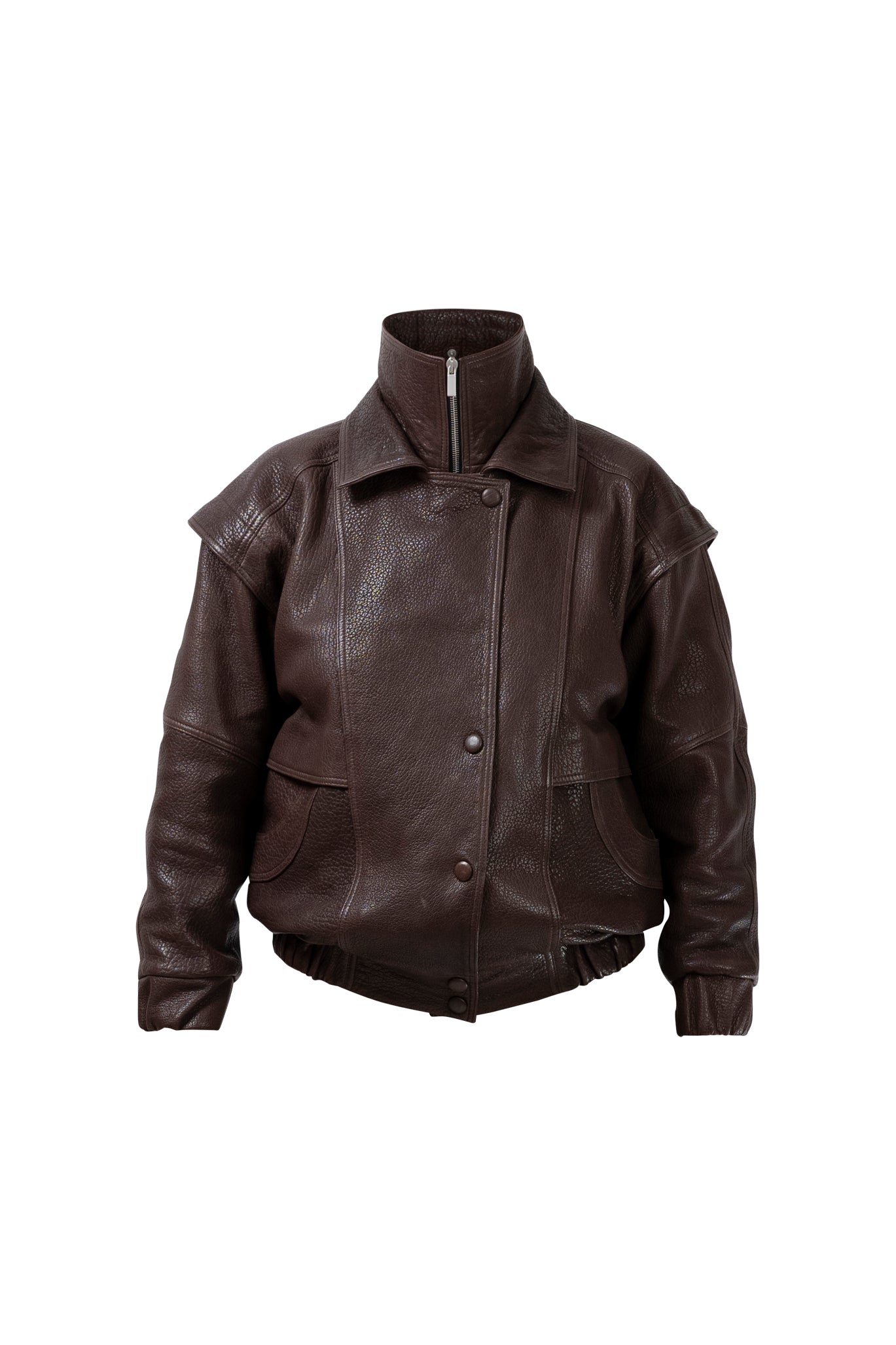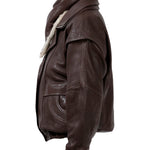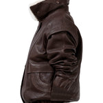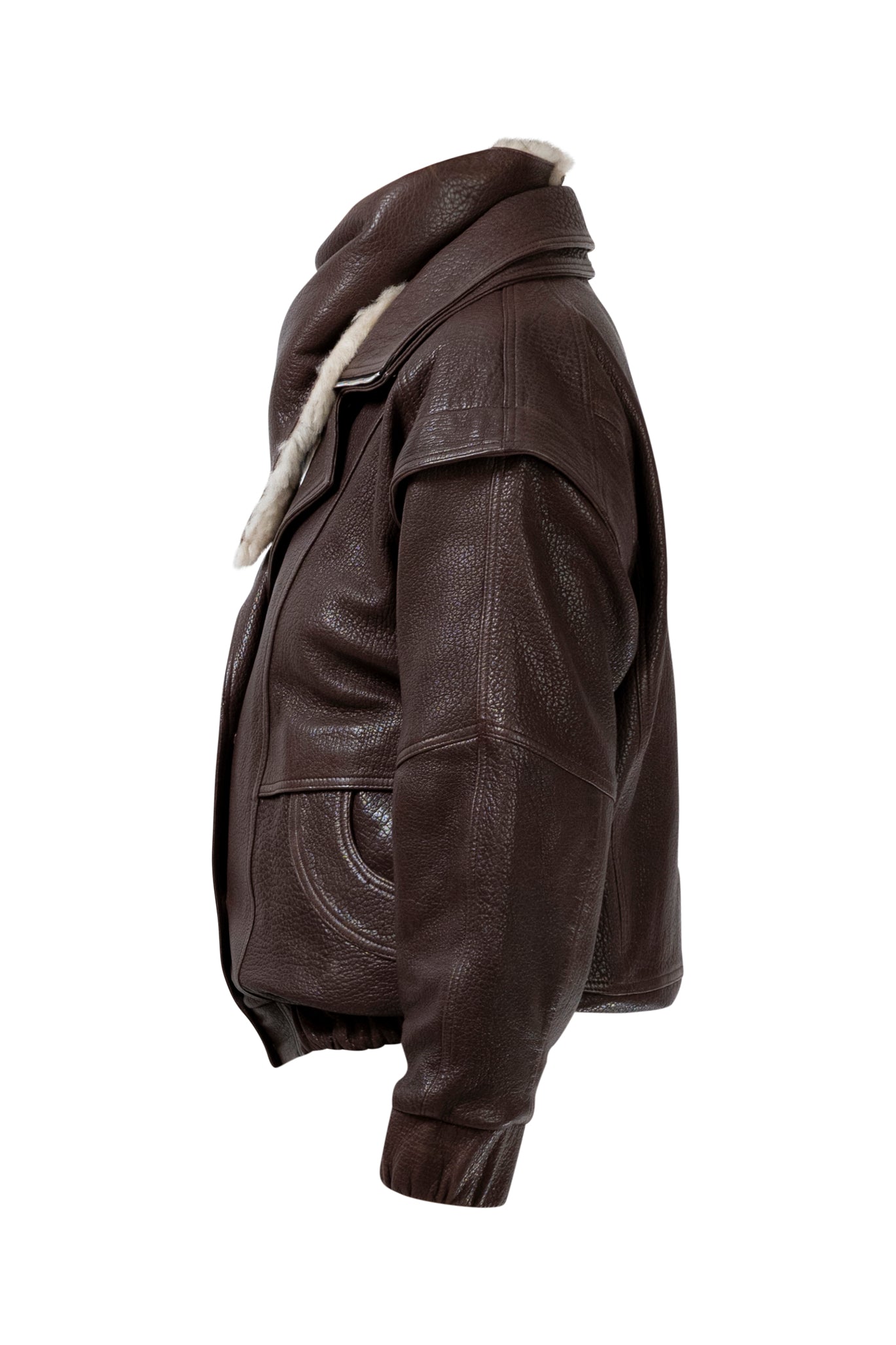 Leather bomber available in rich brown, jet black and navy, cut in a premium, structured hide. Designed with high funnel necks, double collars, includes our signature bandana. Paired with detachable capes sold separately, one in full leather, the other in leather trimmed with shearling. These pieces are engineered for presence, bringing sharp lines and modern versatility to the season.