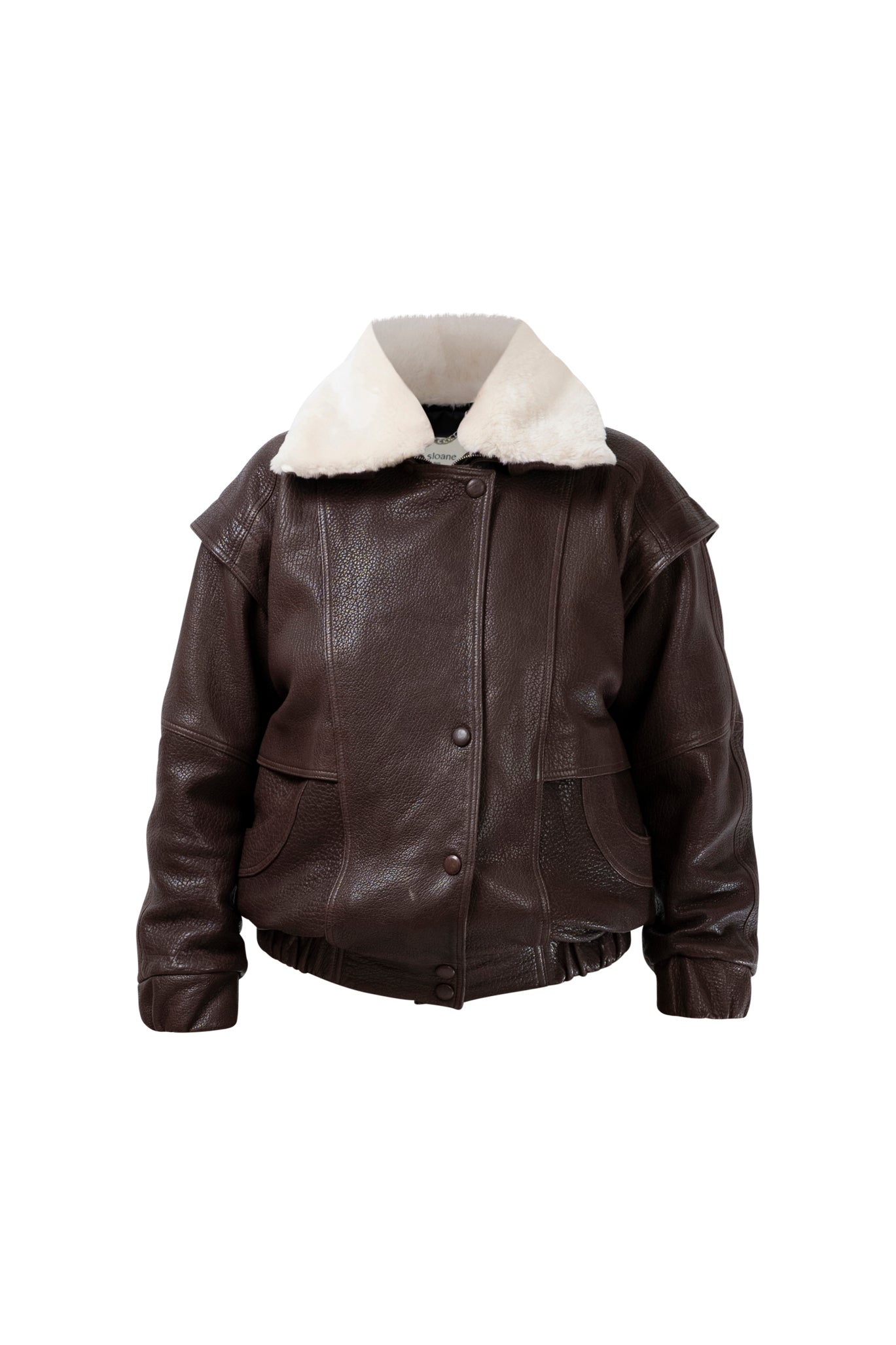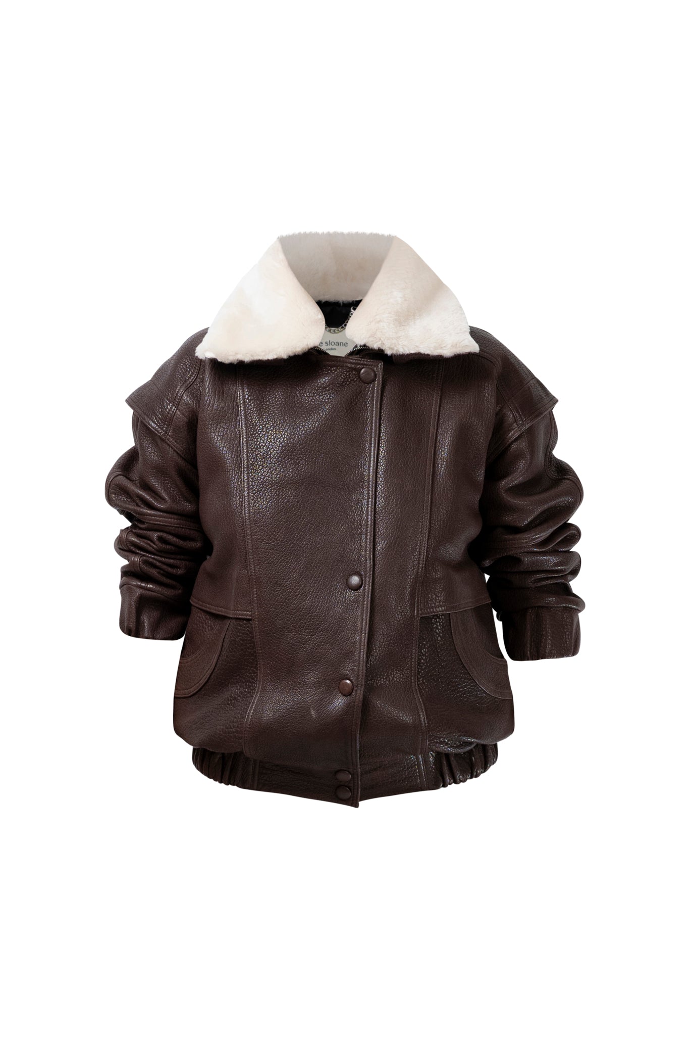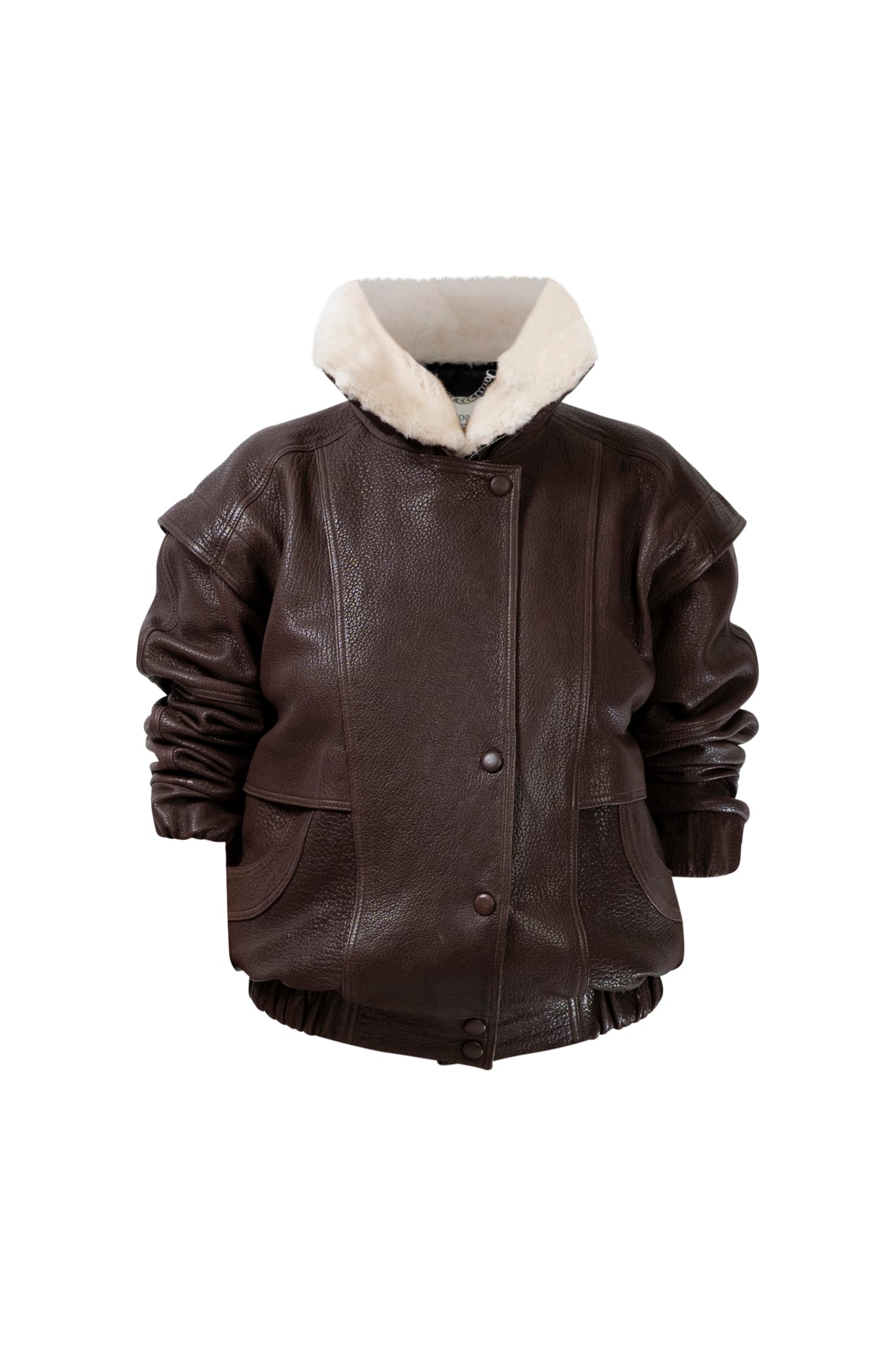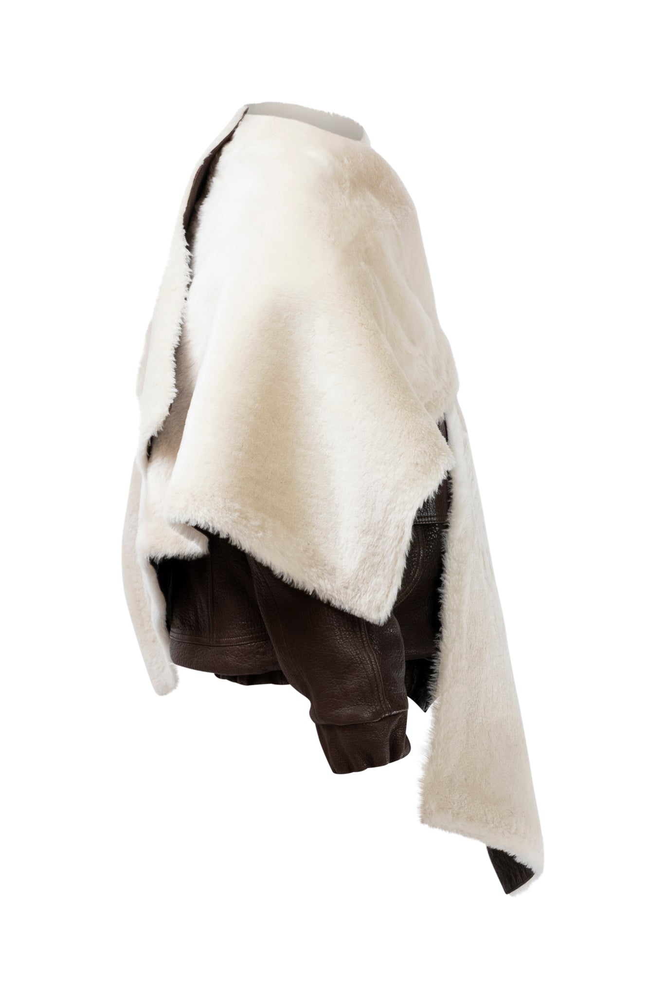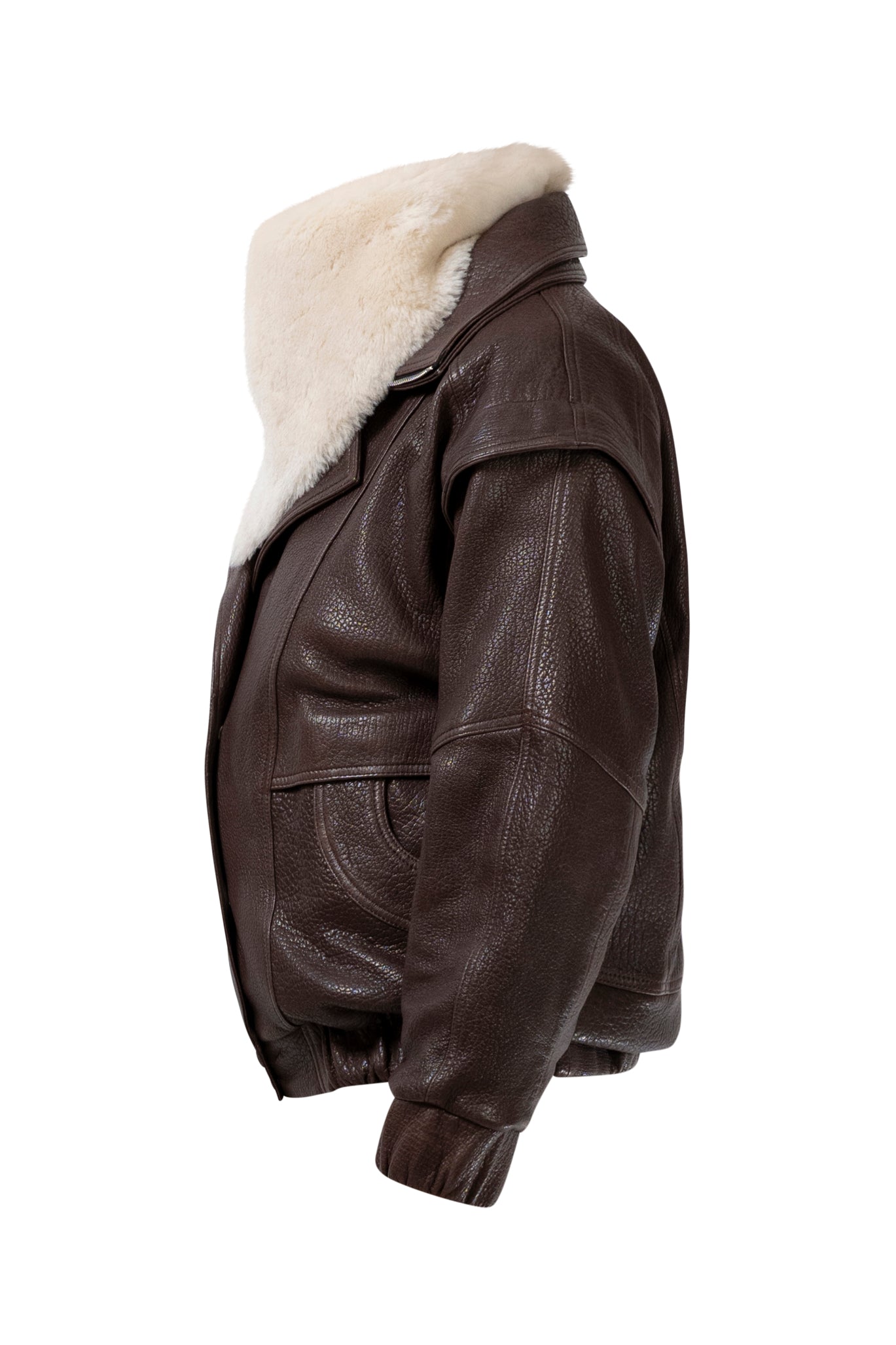Leather bomber available in rich brown, jet black and navy, cut in a premium, structured hide. Designed with high funnel necks, double collars, includes our signature bandana. Paired with detachable capes sold separately, one in full leather, the other in leather trimmed with shearling. These pieces are engineered for presence, bringing sharp lines and modern versatility to the season.