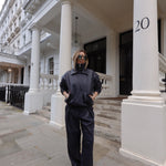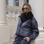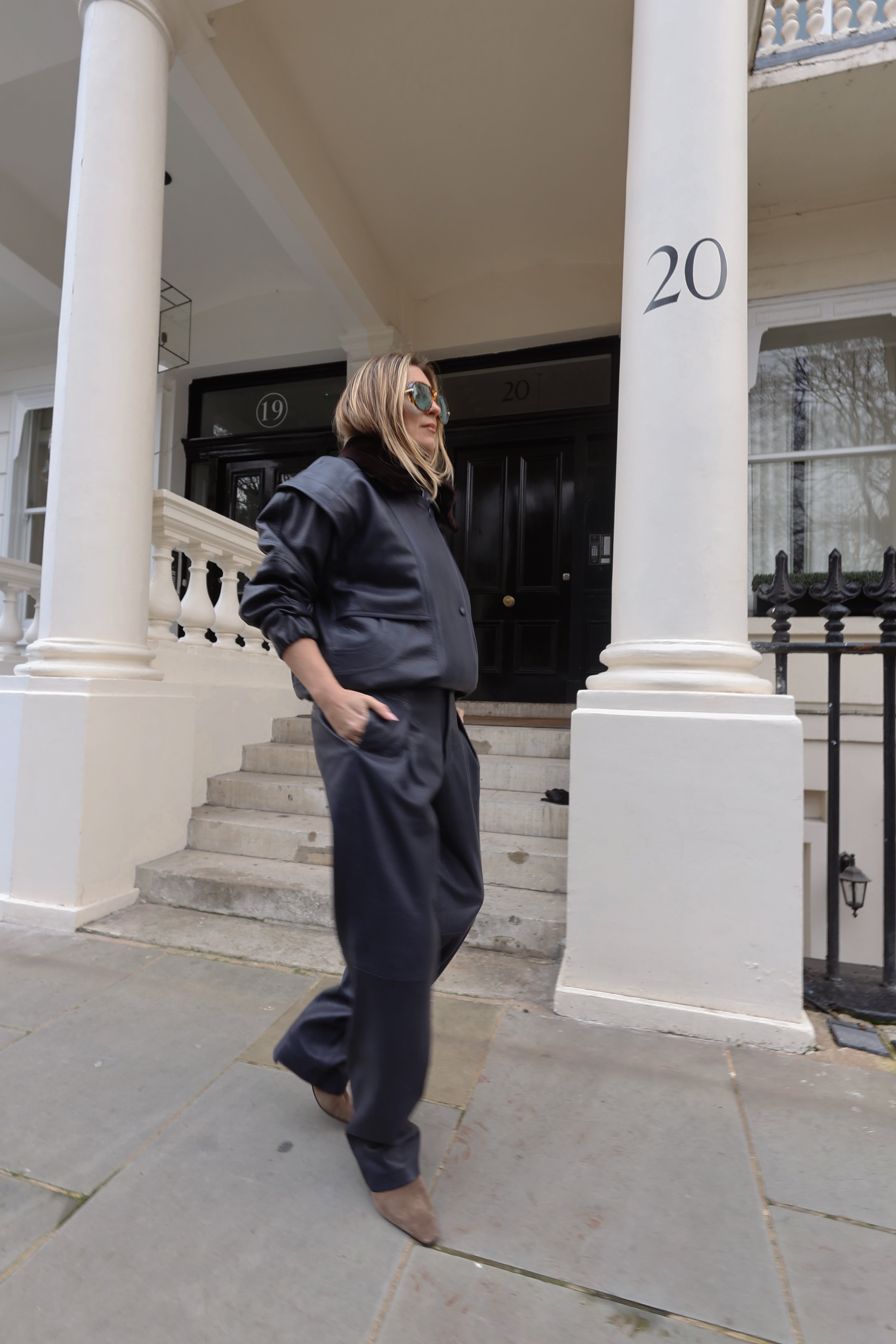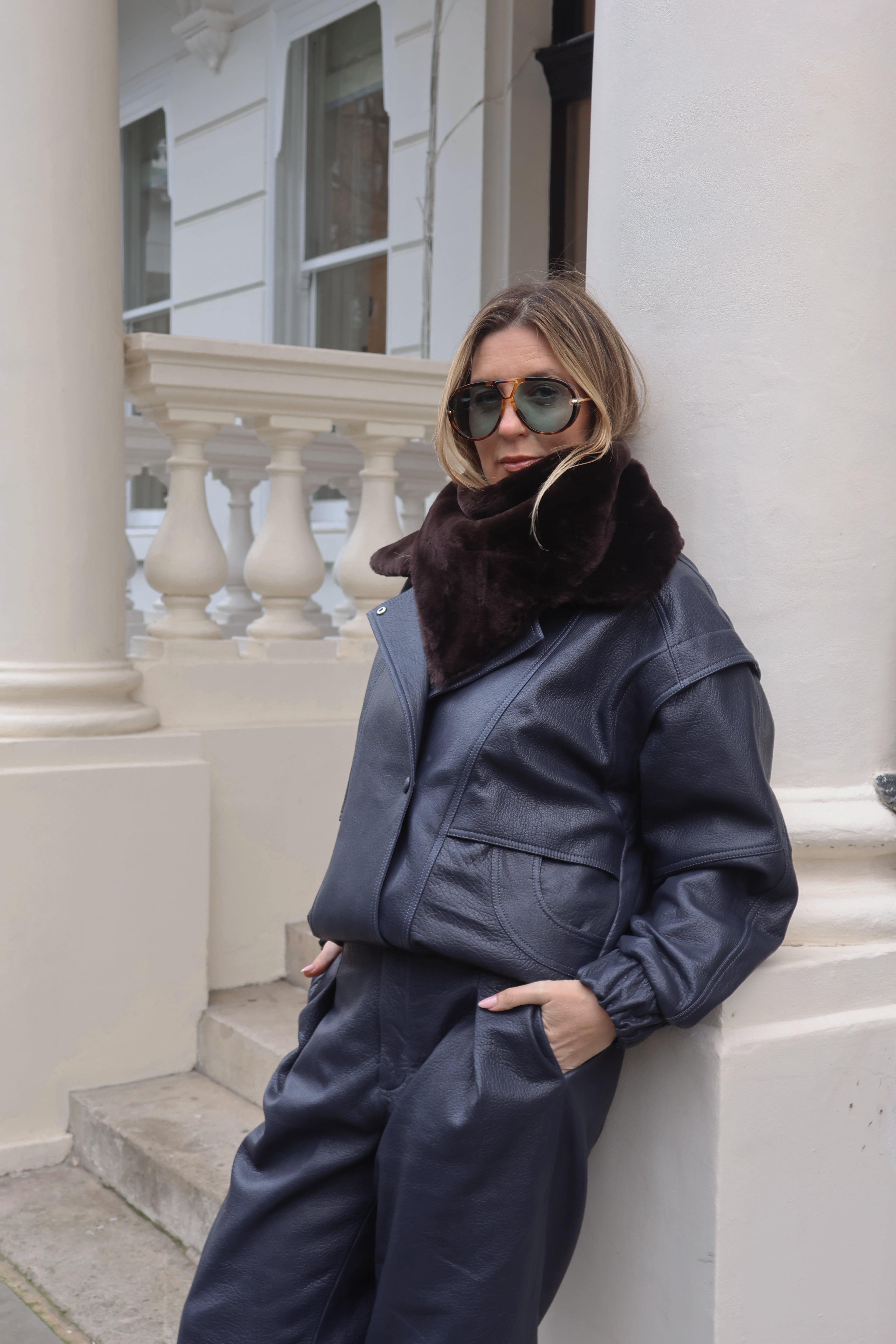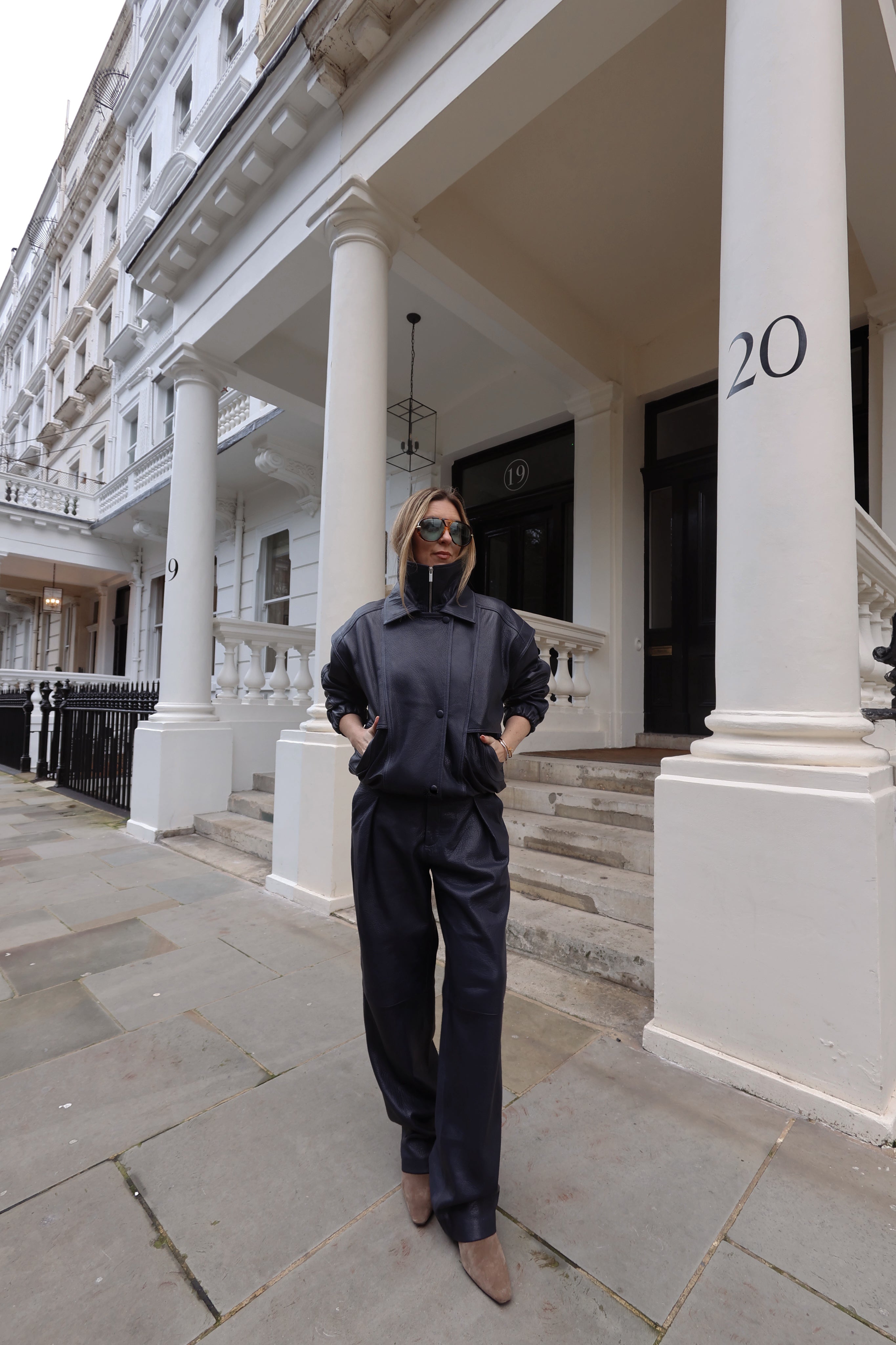 Navy leather trousers. Cut in a classic, standard fit, this timeless style is a true wardrobe essential. Crafted from our signature British made pebbled leather, it pairs effortlessly with the Diamond Girl Bomber and Delilah Capes for a considered, cohesive look. Finished with a signature rue sloane real horn button and functional pockets for everyday ease.