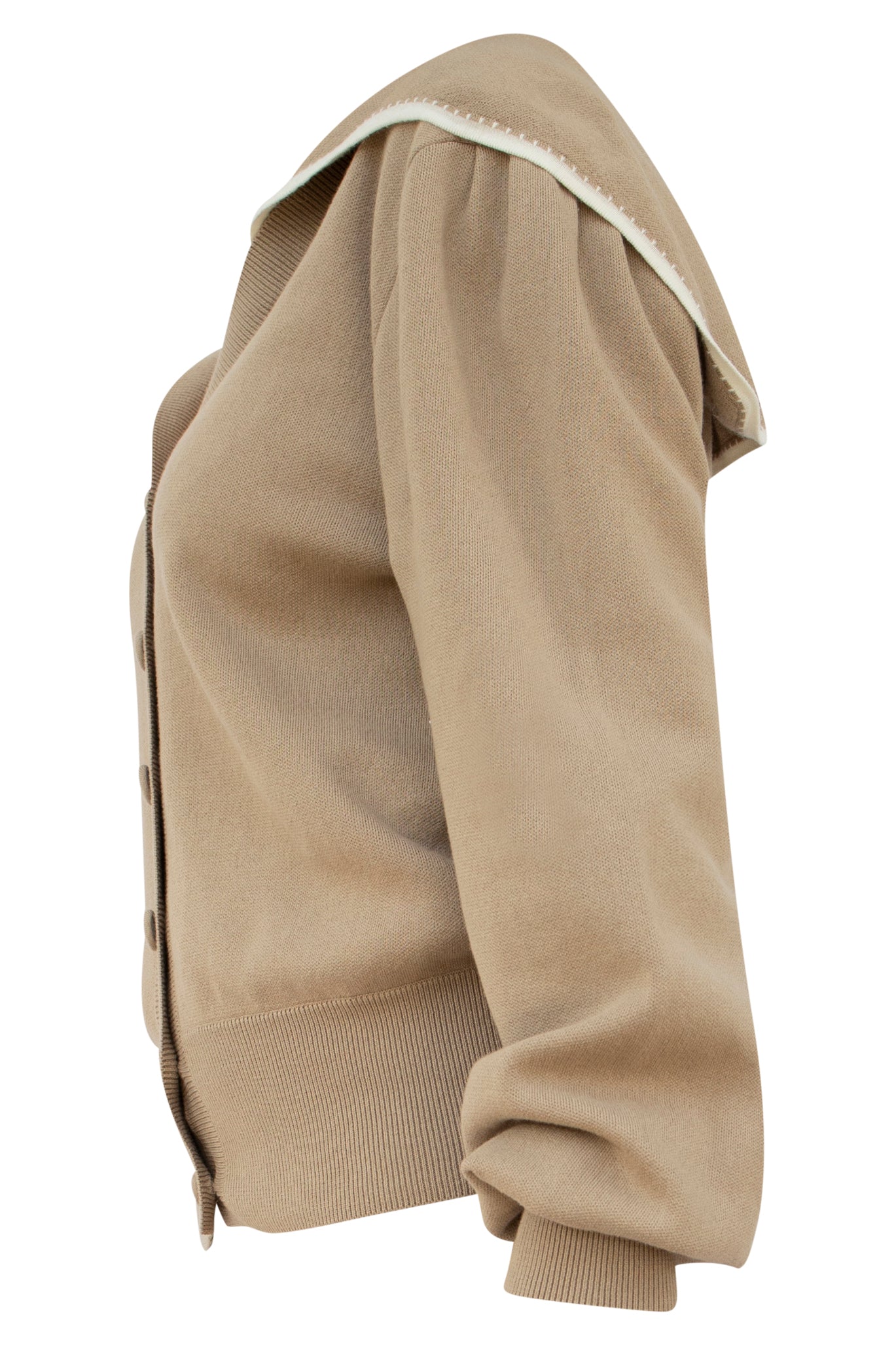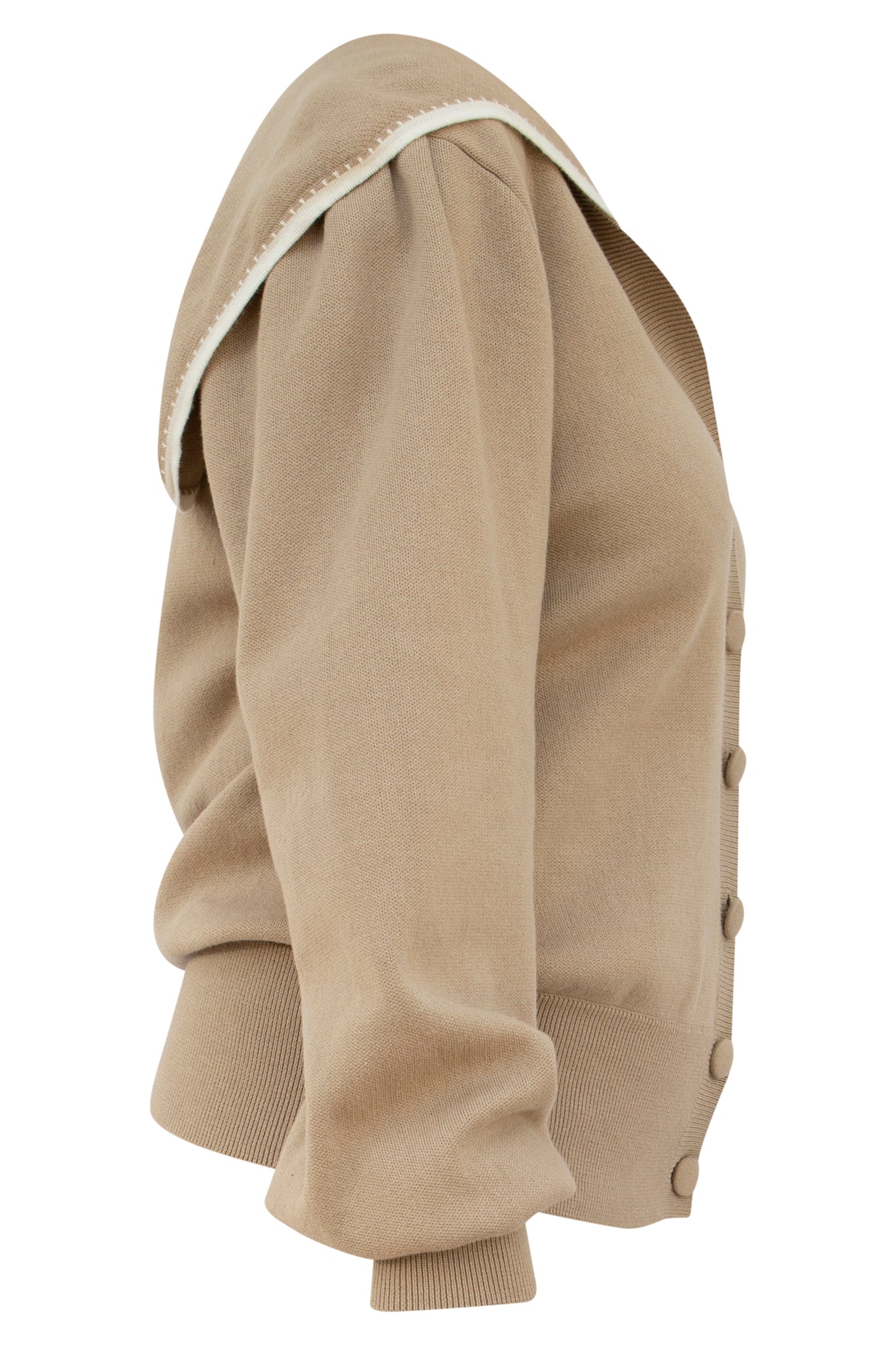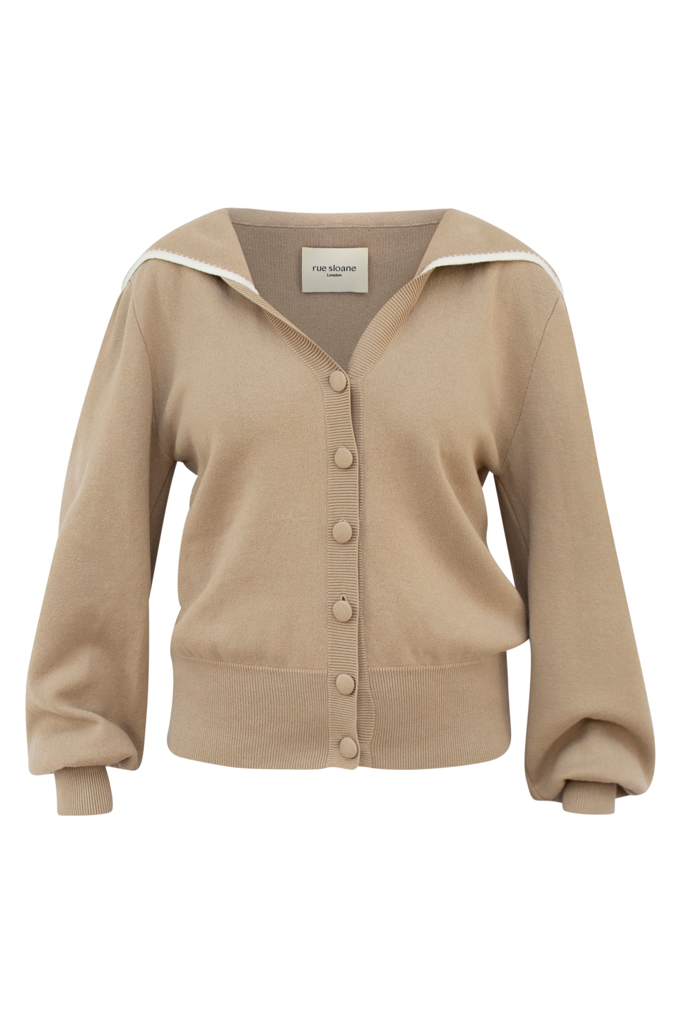 Our sailor-inspired cardigan come in biscuit beige, made from Egyptian cotton cashmere mix. Available as a set with the St Tropez Trousers.