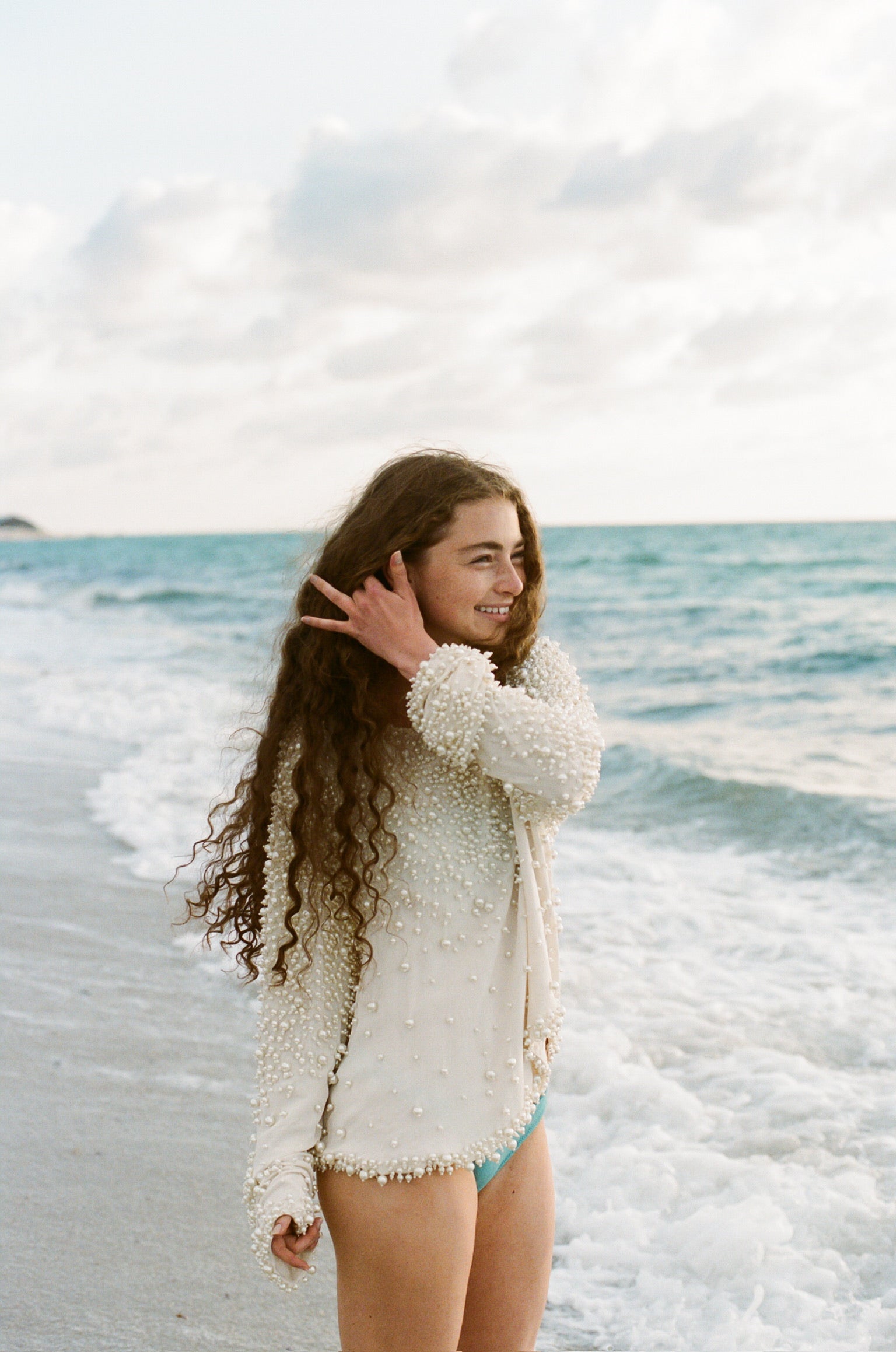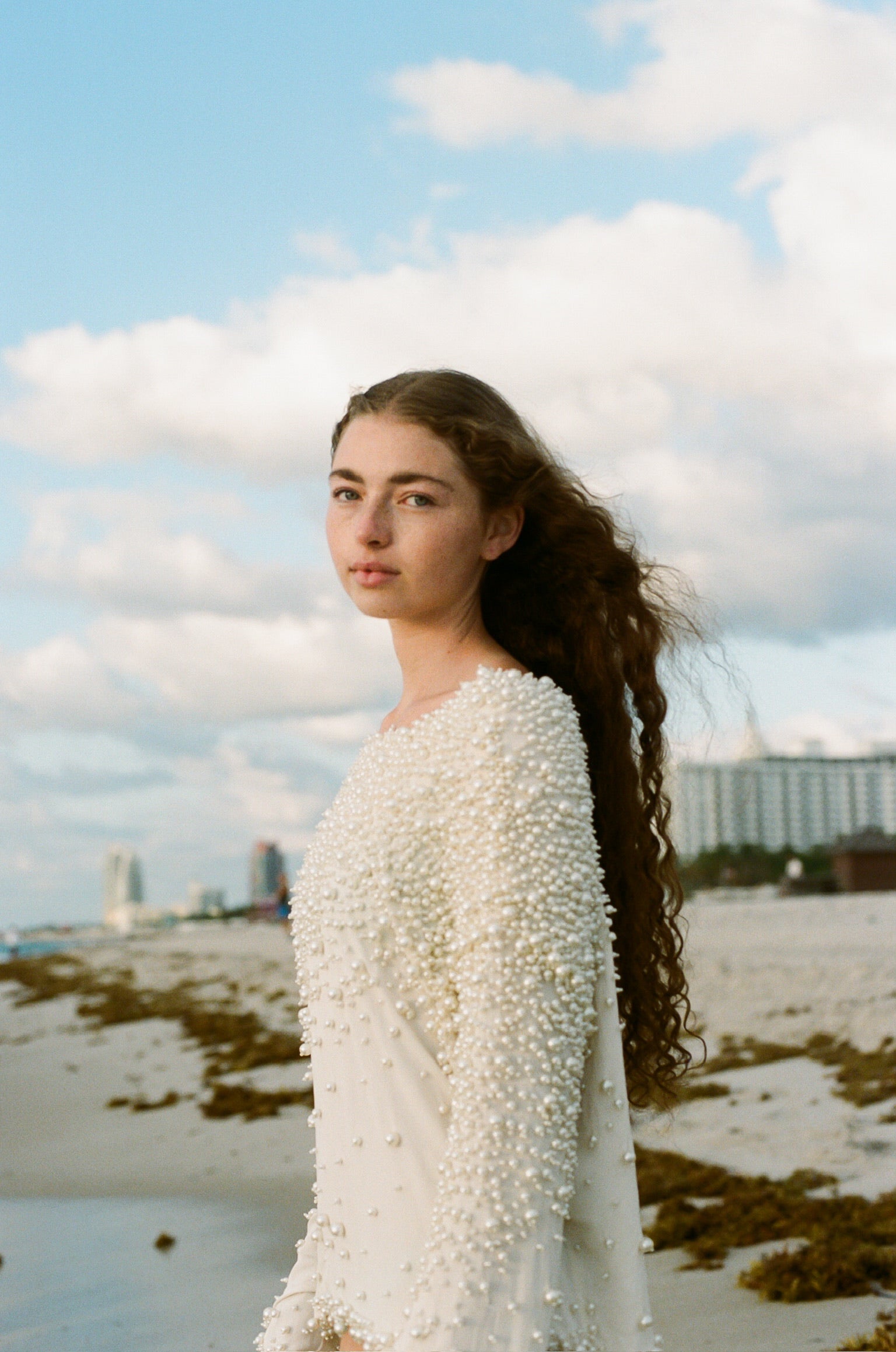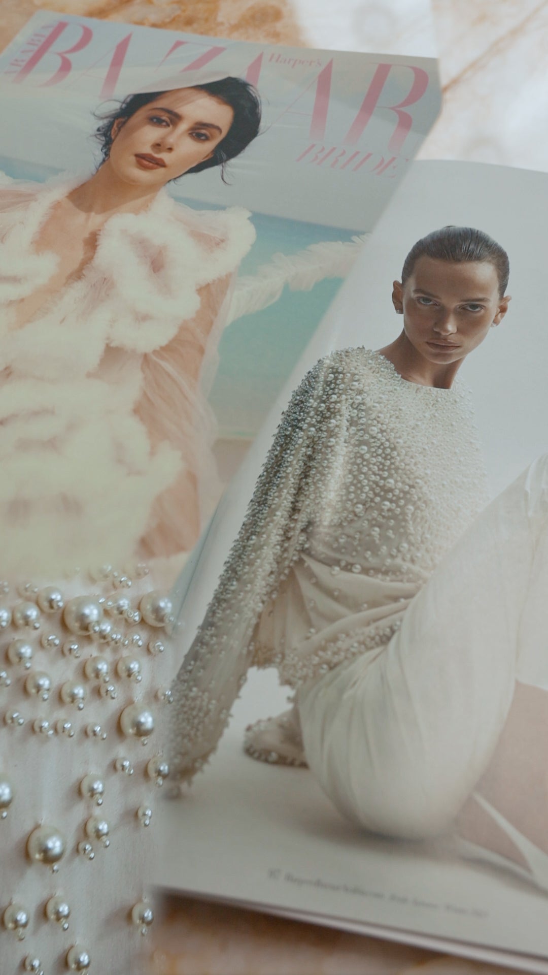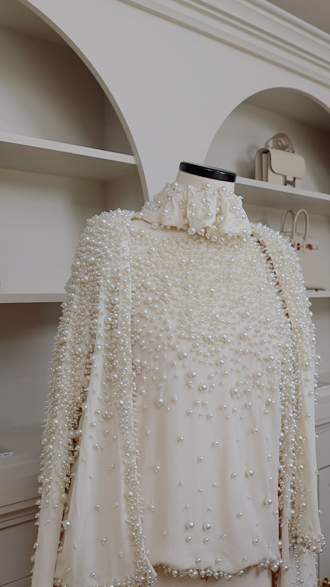 This capsule collection’s trophy piece is designed to be styled with jeans and a tee, dressed-up in the evening or as a bridal accessory. It is made from the highest quality viscose to ensure durability to hold the heavy beading with each high-quality pearl beaded by hand onto the fabric taking fives days to make.