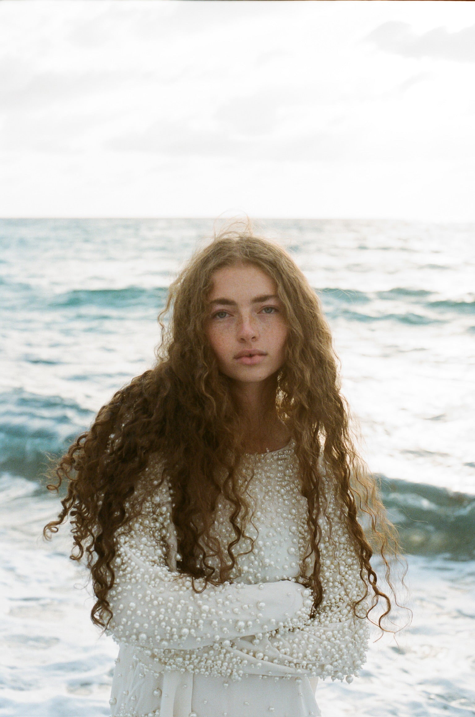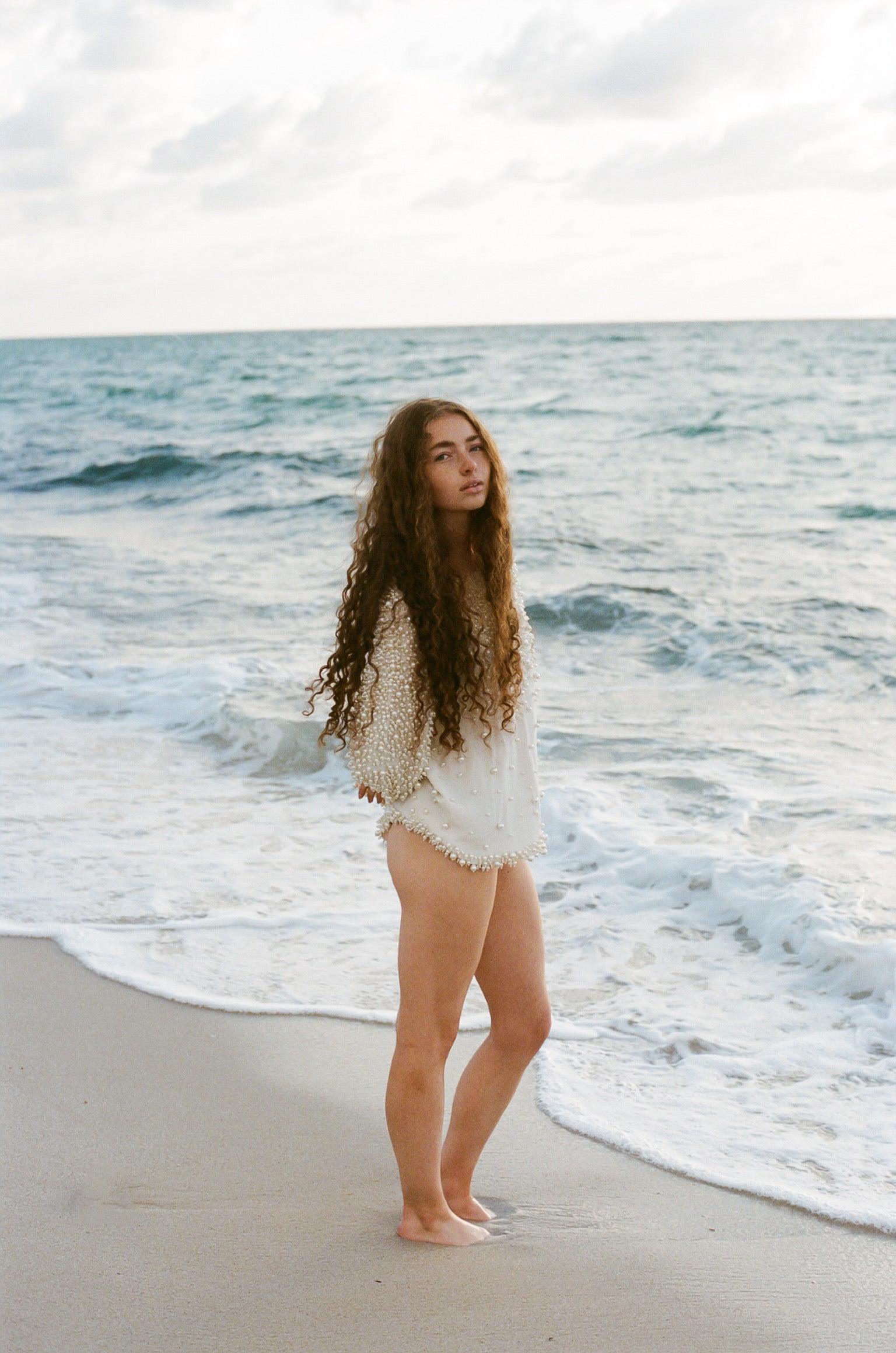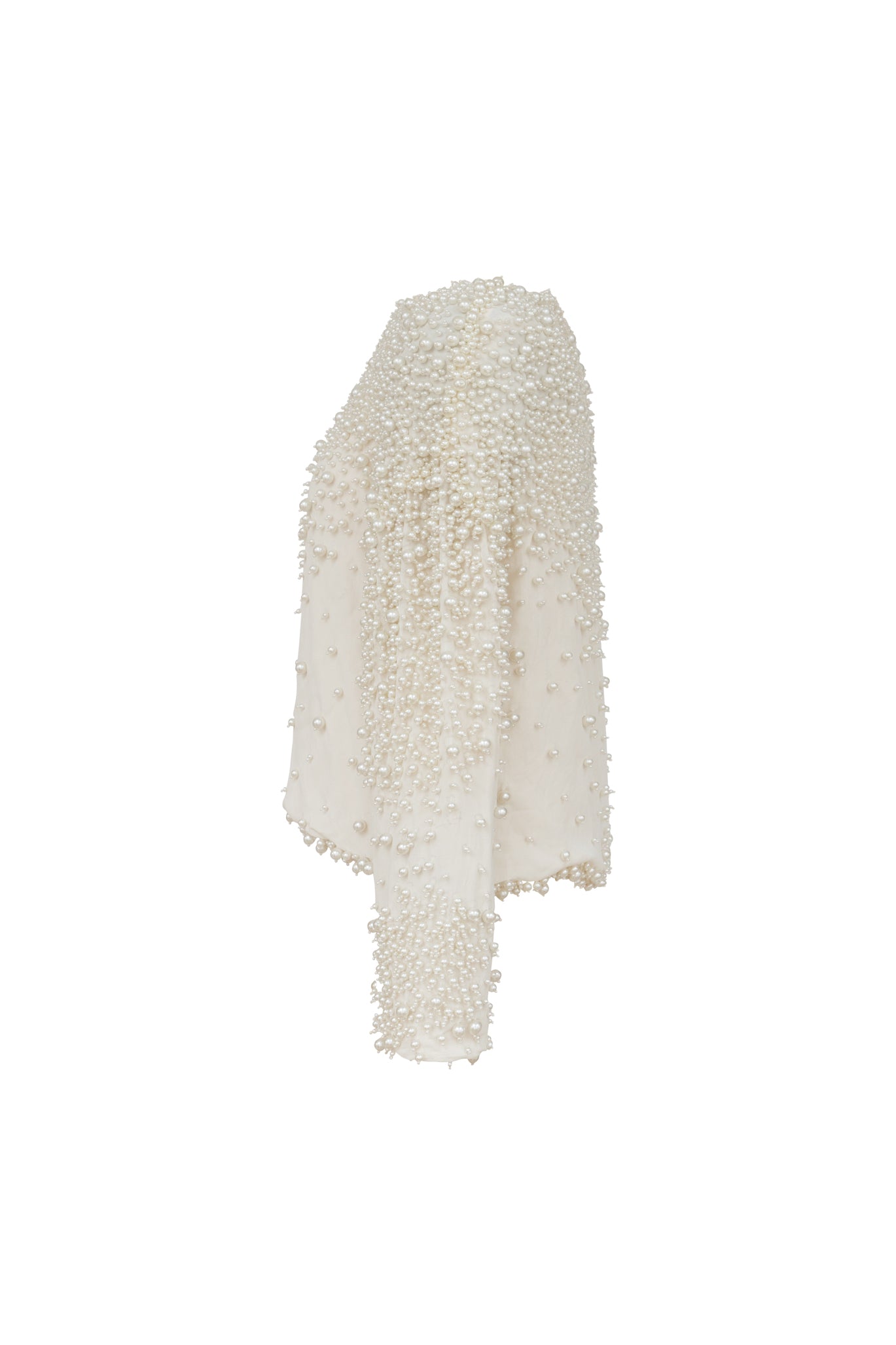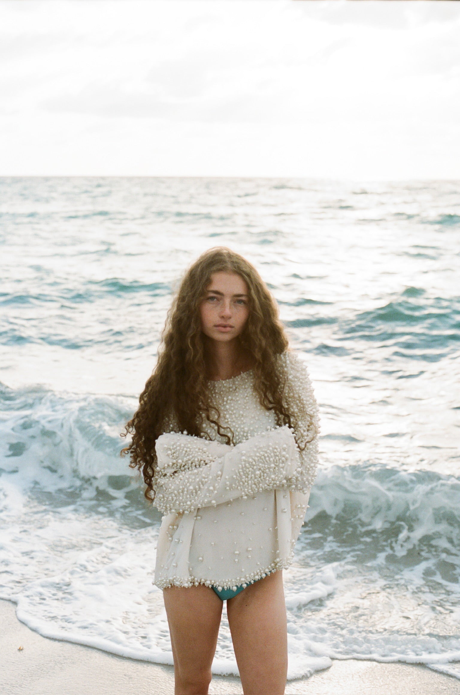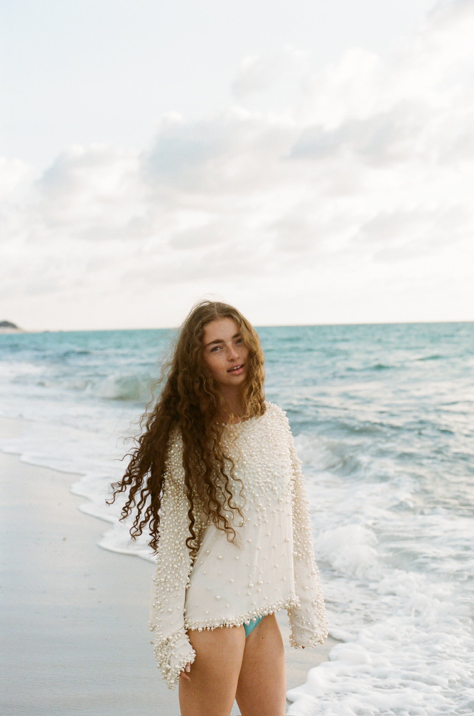 This capsule collection’s trophy piece is designed to be styled with jeans and a tee, dressed-up in the evening or as a bridal accessory. It is made from the highest quality viscose to ensure durability to hold the heavy beading with each high-quality pearl beaded by hand onto the fabric taking fives days to make.