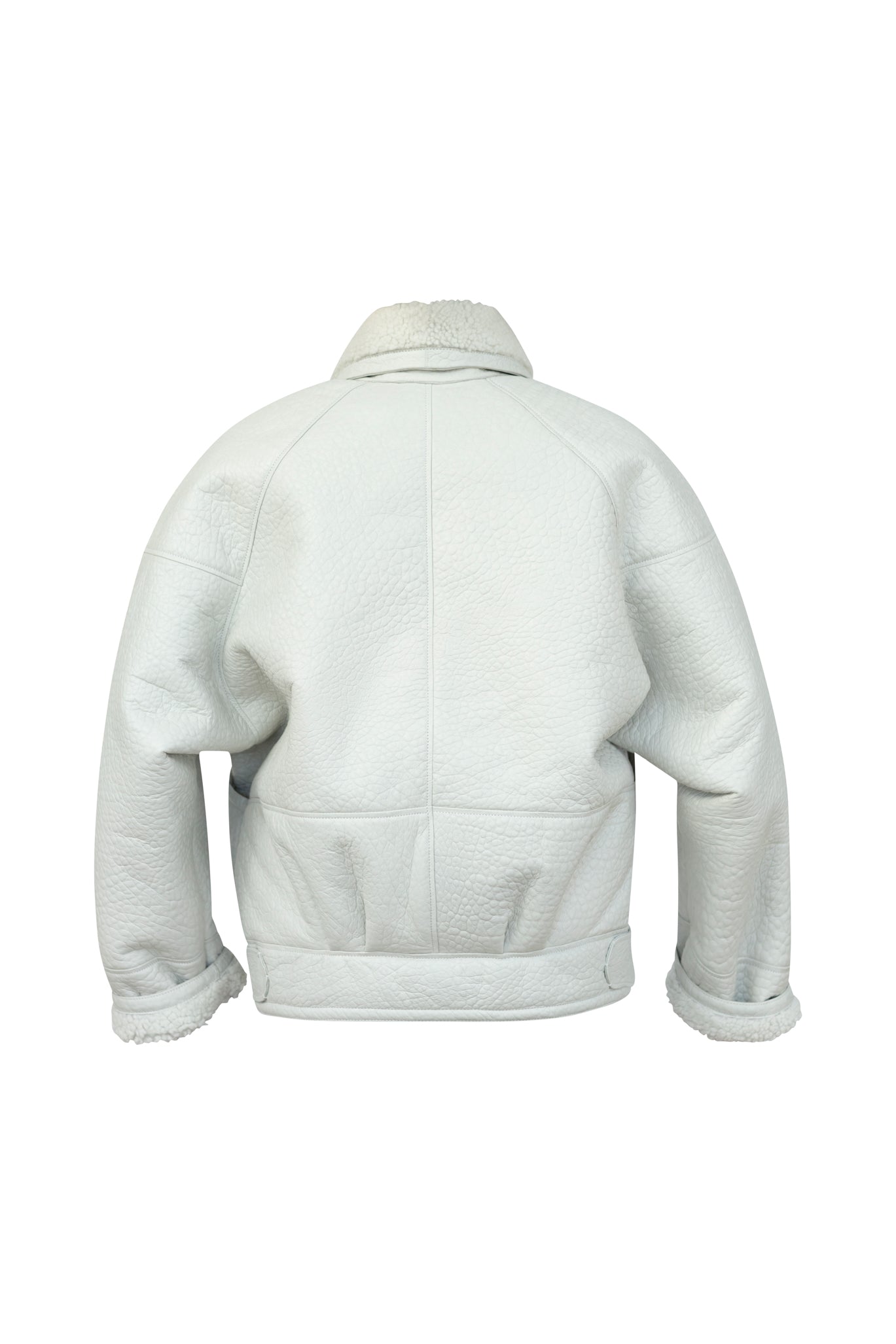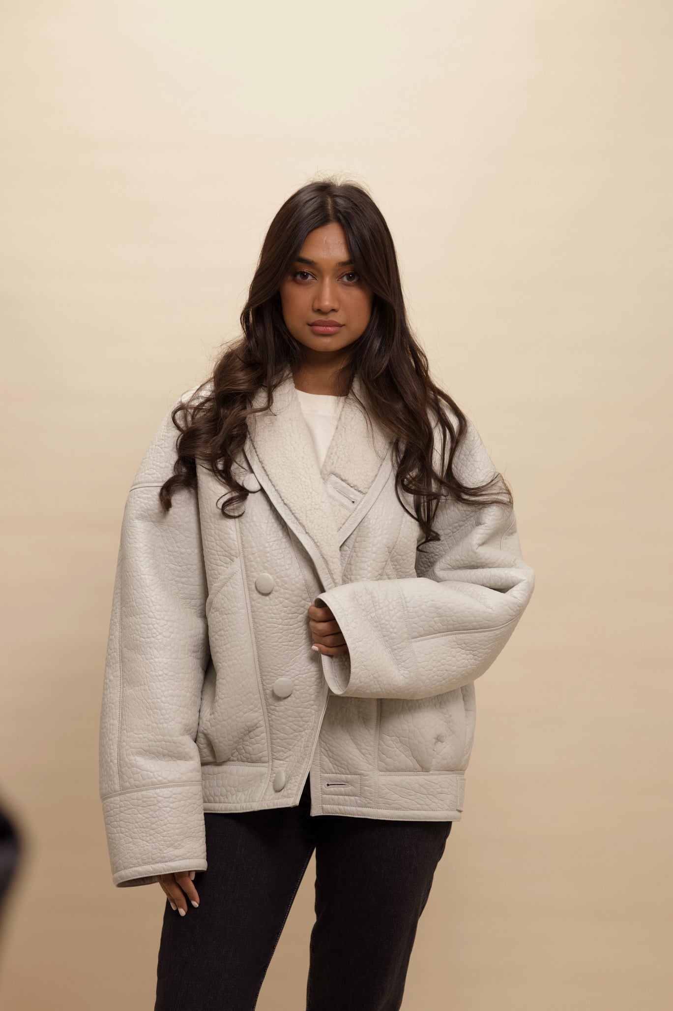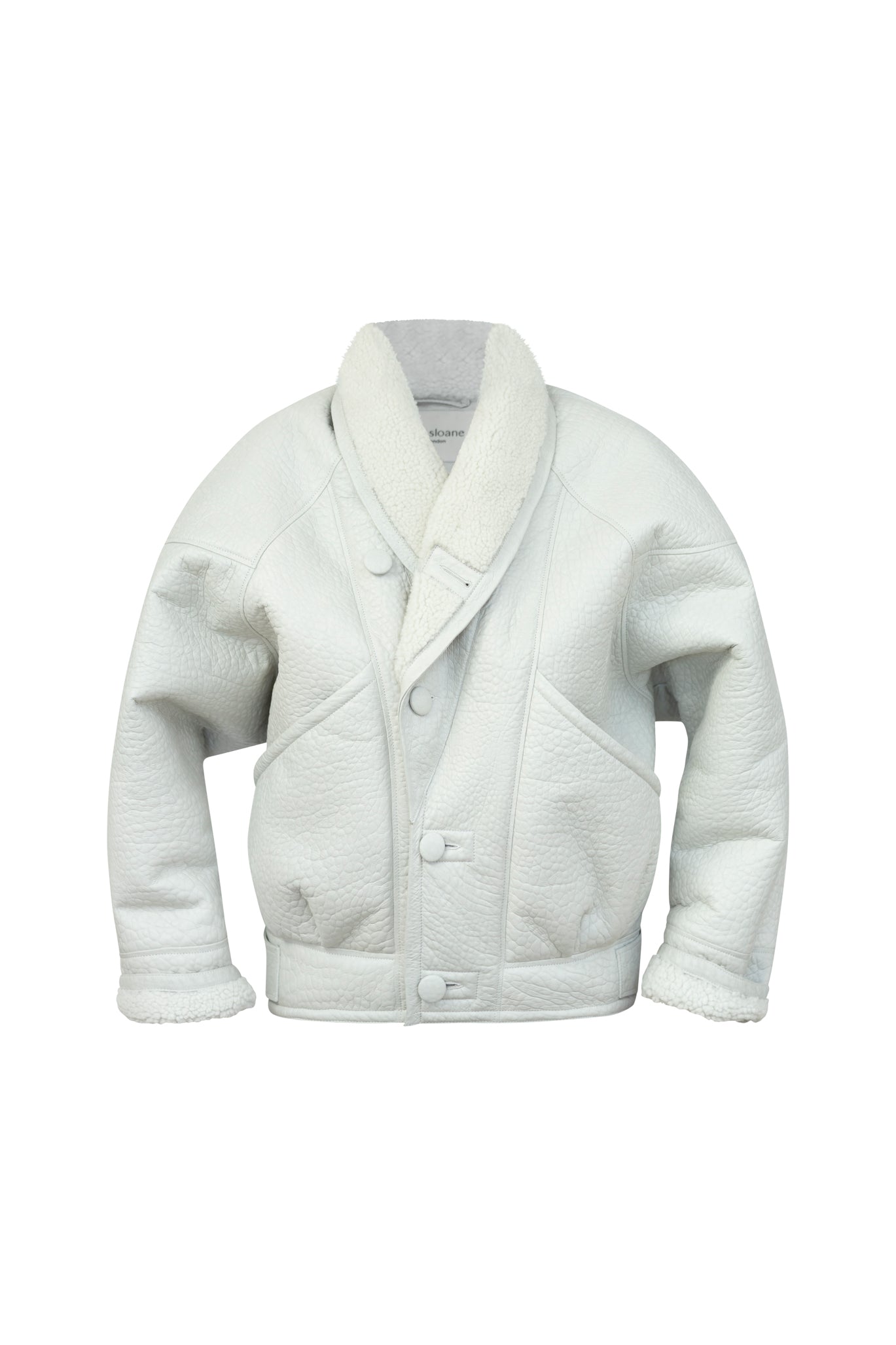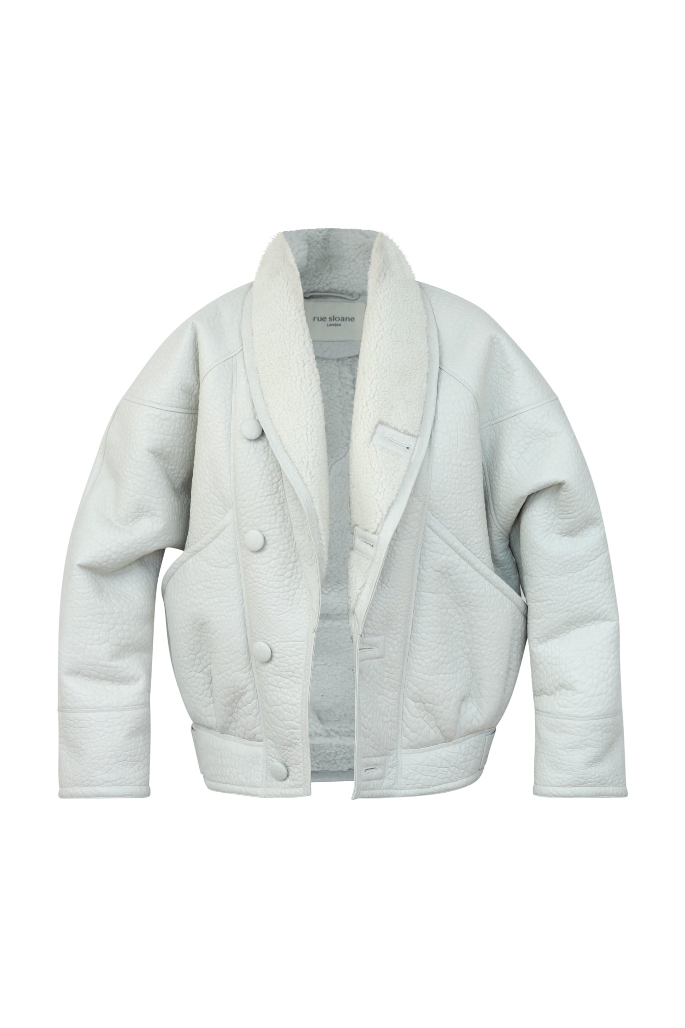 Cloud White: A muted off white with a grey undertone. The most chic white leather you will ever come across. Think British clouds! With tonal sheepskin for an elegant finish, making the coat very easy to style and be the perfect finish touch to any statement look. Finished in matte leather and elephant print.