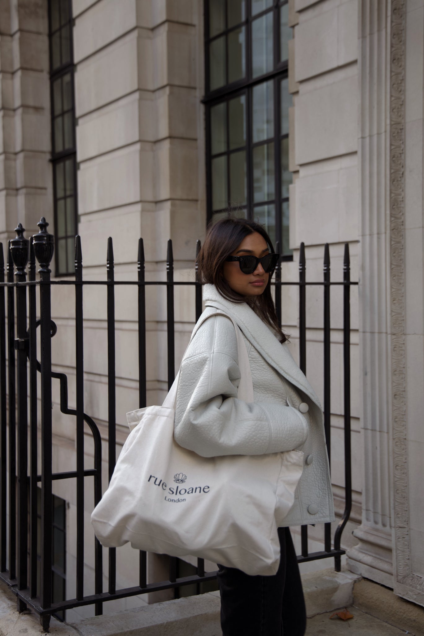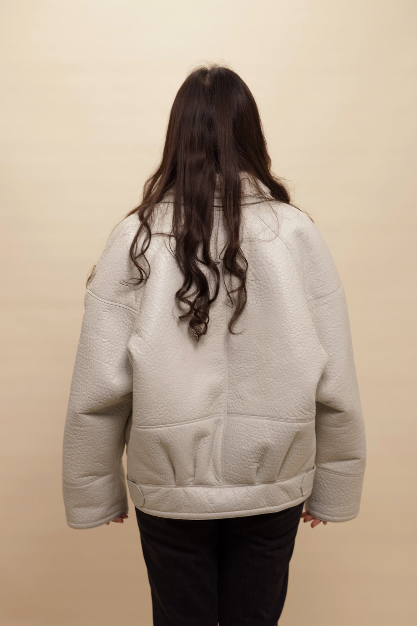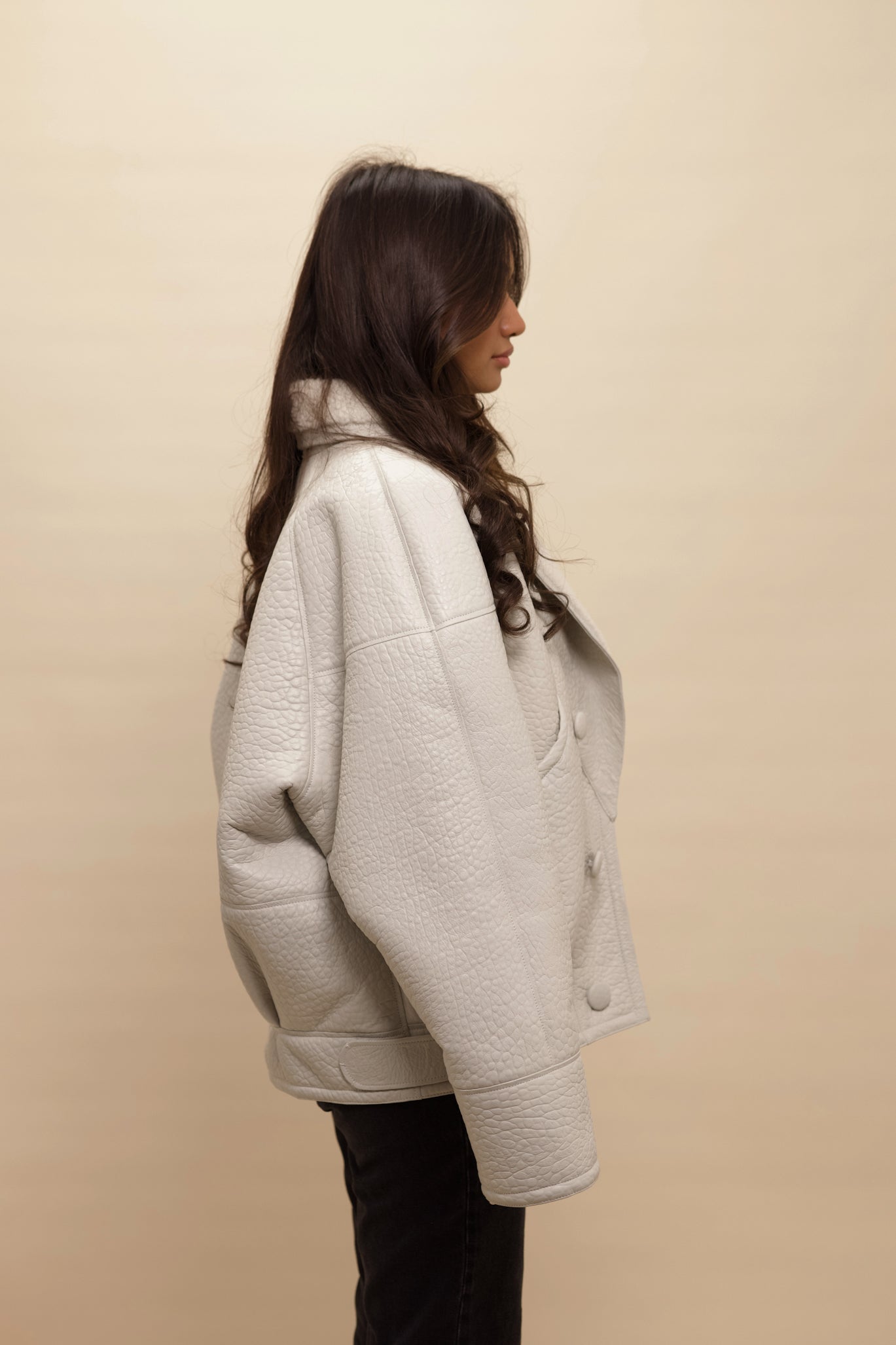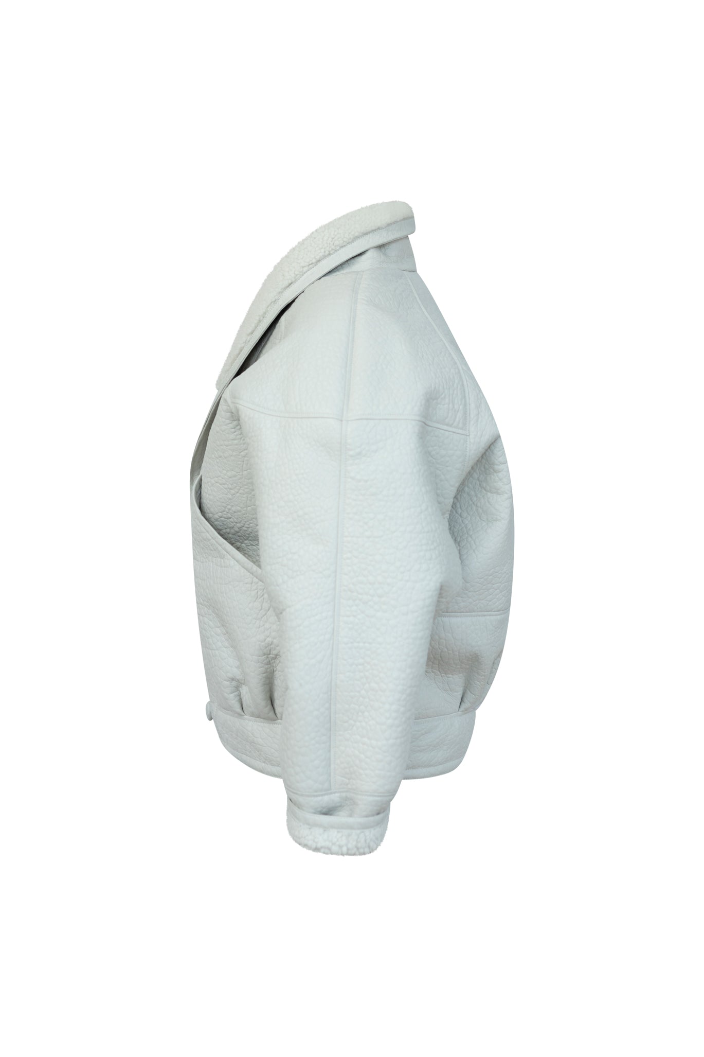 Cloud White: A muted off white with a grey undertone. The most chic white leather you will ever come across. Think British clouds! With tonal sheepskin for an elegant finish, making the coat very easy to style and be the perfect finish touch to any statement look. Finished in matte leather and elephant print.